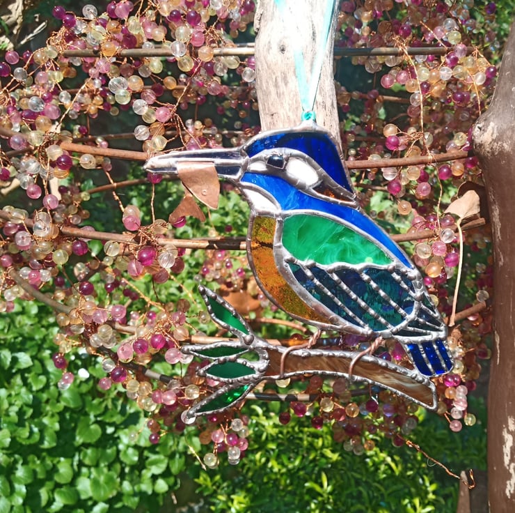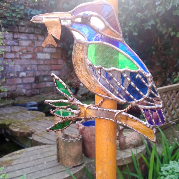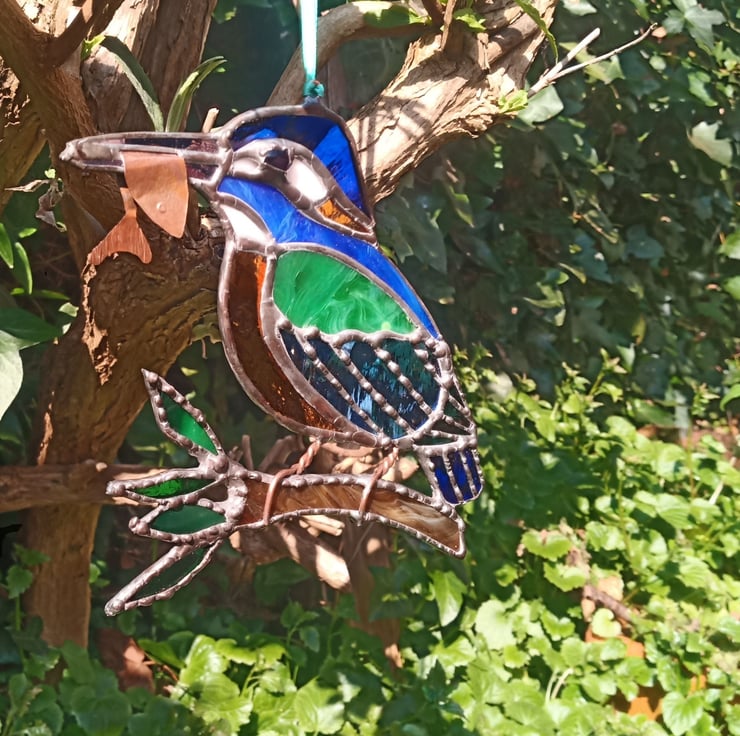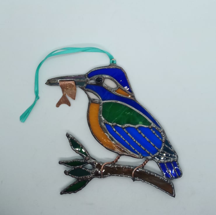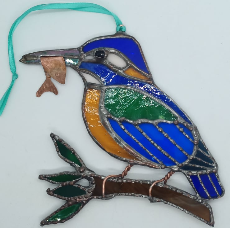 A beautiful Kingfisher with his freshly caught dinner in his beak. Created in the Tiffany Style with blue, green, white, brown and orange glass cut to shape and copper foiled before being soldered together. The fish is made from textured copper foil and he has copper wire legs. Decorative solder adds detail on the wing and branch and it's finished with a copper patina polished and sealed with silicon wax.