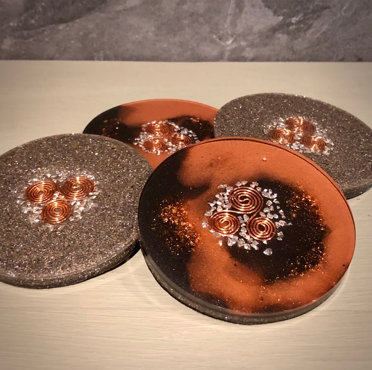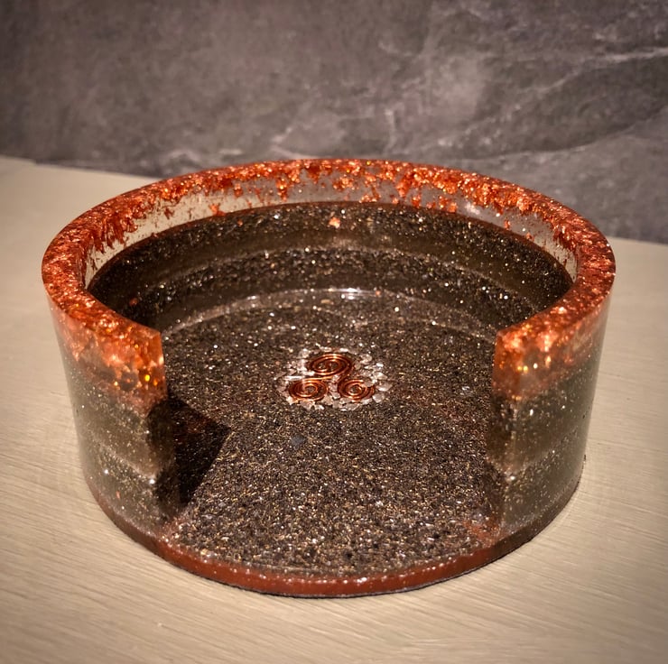 Made from resin, these beautiful Orgonite charging plates (4) come with a matching holder. There are two plate designs both functioning as Orgonite, helping to keep those nasty EMF (electromagnetic frequencies) at bay. Encasing Clear Quartz crystals deep in the mix of metal shavings, copper and iron powders they not only double up as charging plates for crystals, they can also be used as coasters (heat resistant up to 95C). The Triskelion copper spiral not only adds a beautiful decorative feature, it also circulates the energy within the plate, acting like a conduit and enhancing the orgonites power! For more information on Orgonite, please view the "Inspiration" section below.
