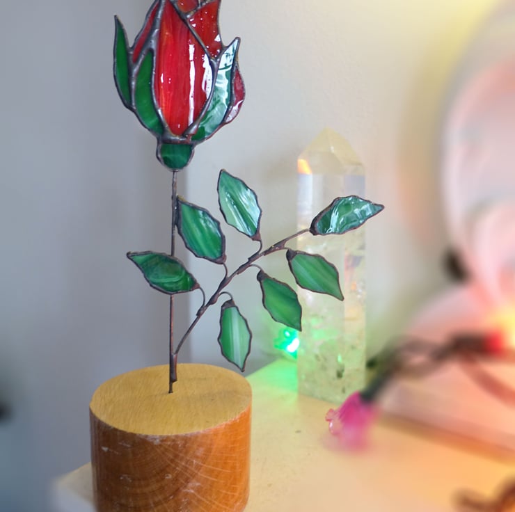 This stained glass rose is a true work of art, radiating an enchanting glow that will captivate any room. Showcasing the vibrant hues and intricate details of a classic red rose, it's the perfect addition to any home decor, adding a touch of elegance and sophistication. Whether displayed on a shelf, mantel, or side table, this stunning piece will elevate your space and bring a sense of timeless beauty.