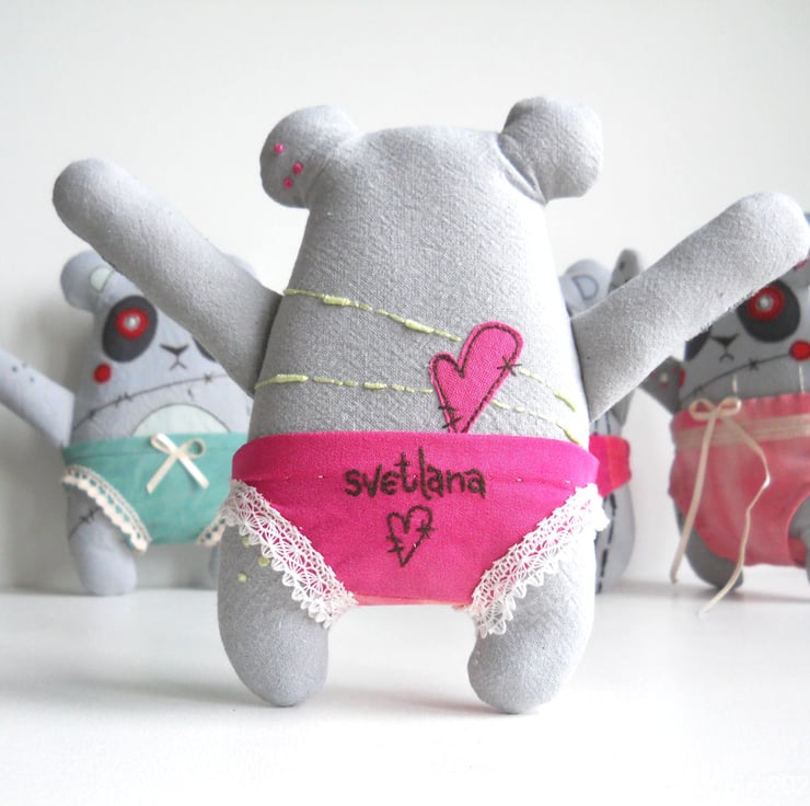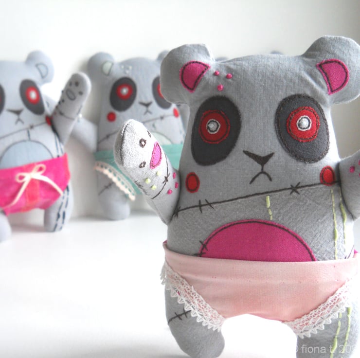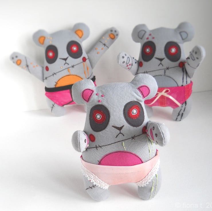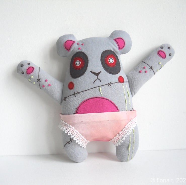 applique, machine & hand embroidered zombie panda in silk knickers.