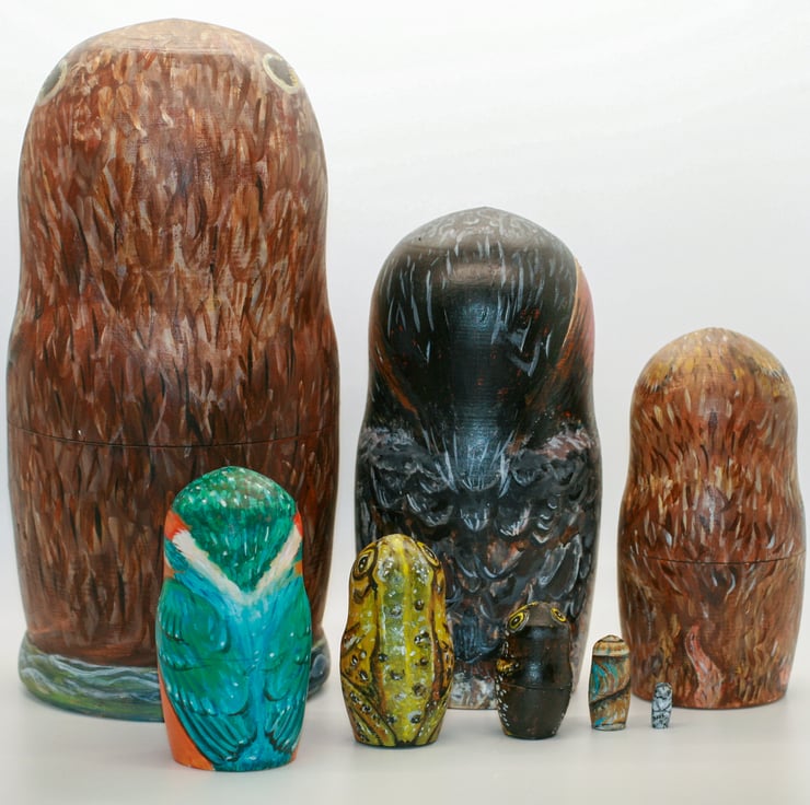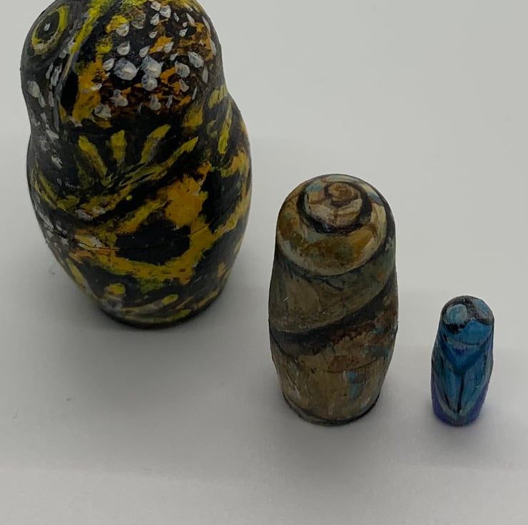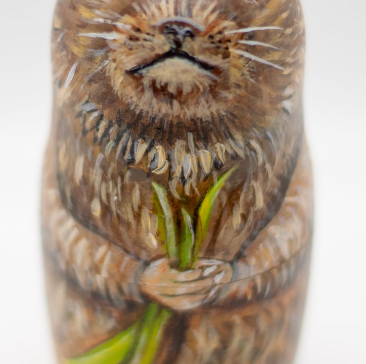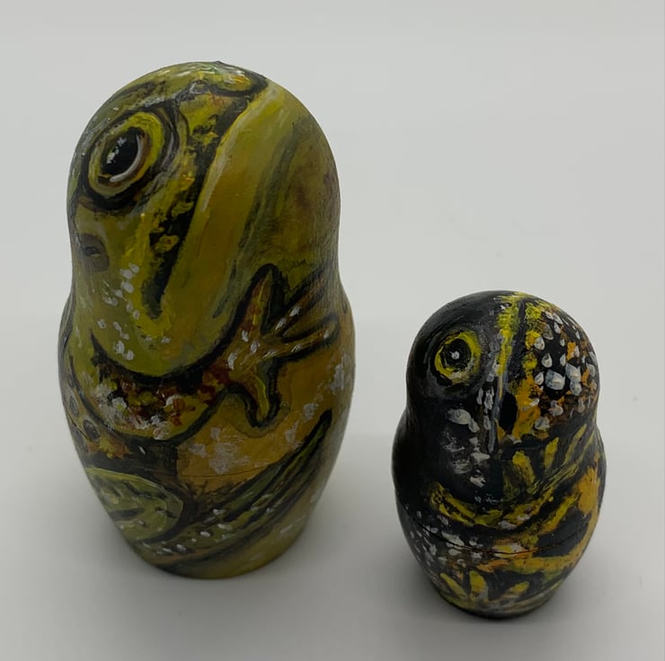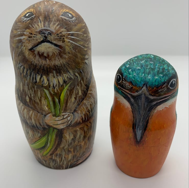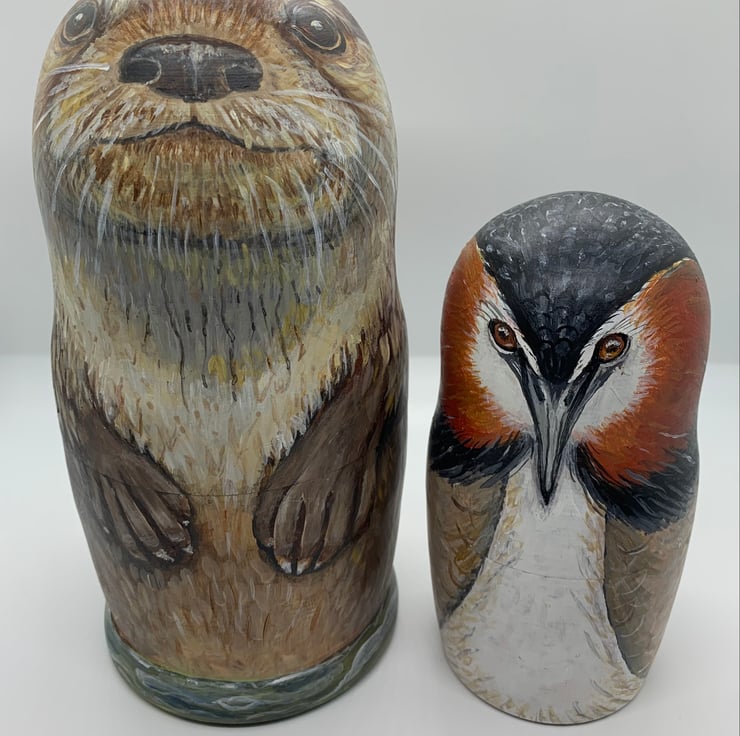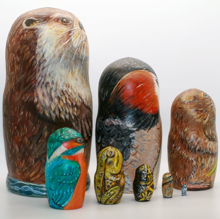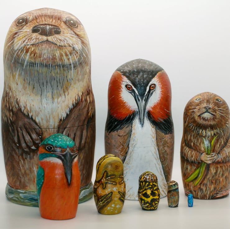 Splish Splash! Here is a set of 8 unique hand-painted nesting Russian dolls. Each piece is a mini work of art, lovingly painted in detail with Windsor and Newton acrylic paint. The finished pieces have been given at least two coats of acrylic satin varnish to protect them from damage.