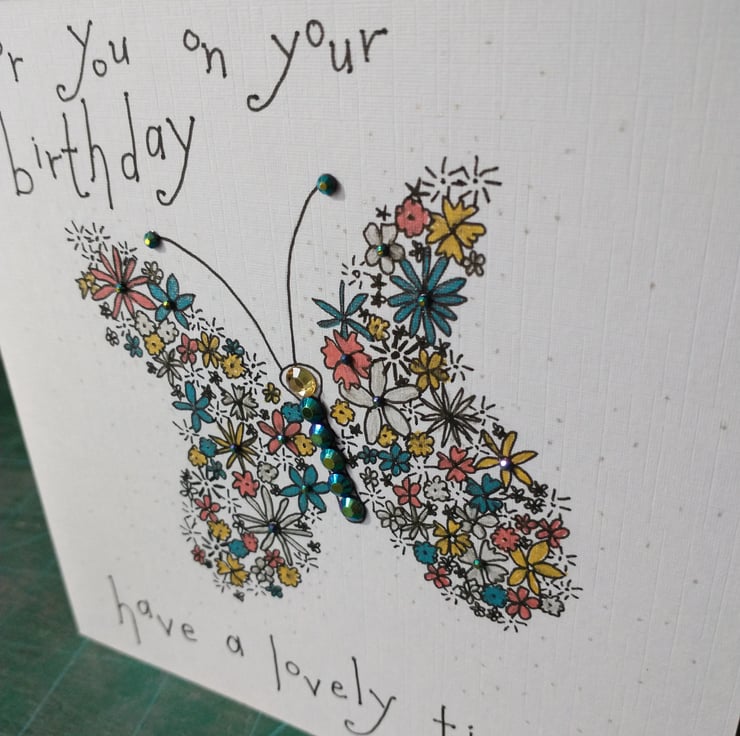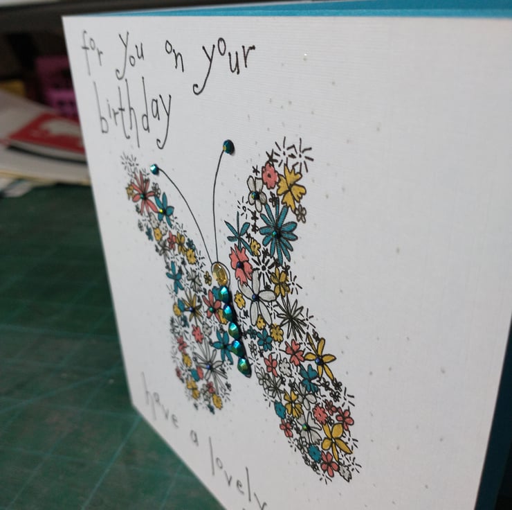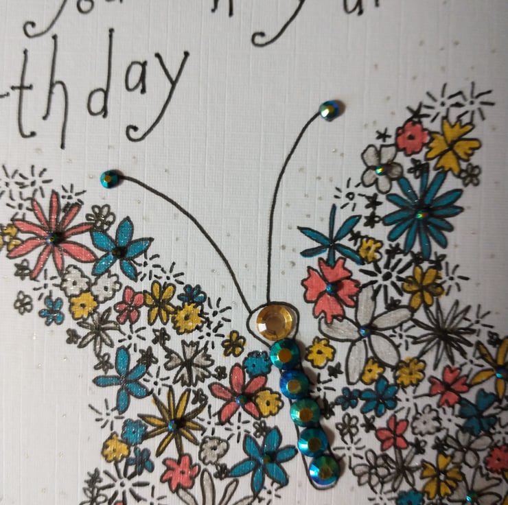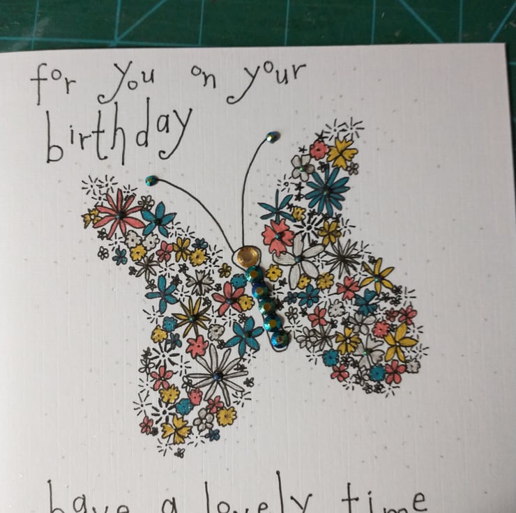 A completely handmade and uniquely designed card. Consisting of a butterfly hand drawn and coloured of lots of flowers. For you on your birthday, have a lovely time handwritten in black ink. Drawn on pristine white quality linen effect card. Finished off with blue and gold rhinestones
