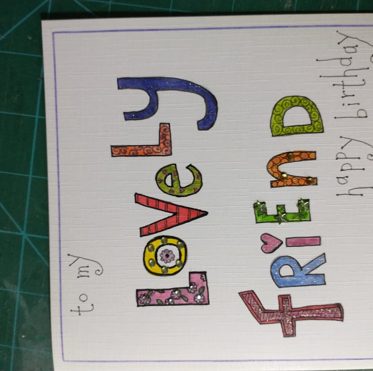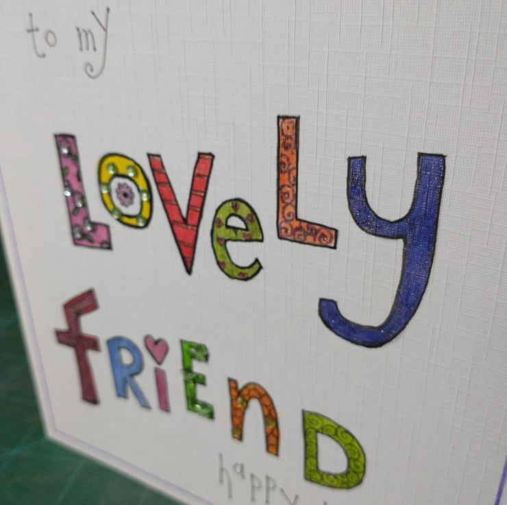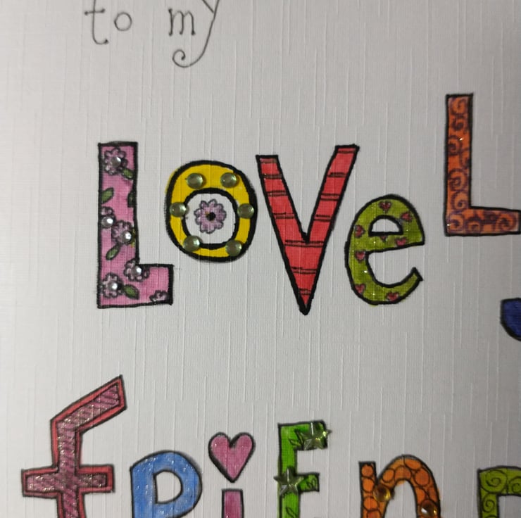 A completely handmade and uniquely designed card. Consisting of lovely friend hand drawn and coloured on pristine white quality linen effect card. Embellished with sequin beads