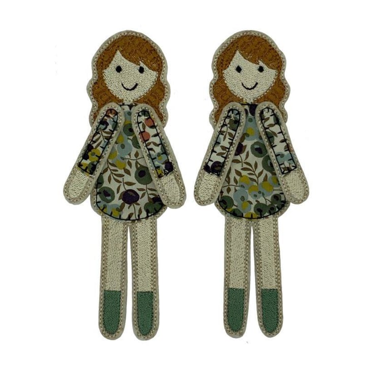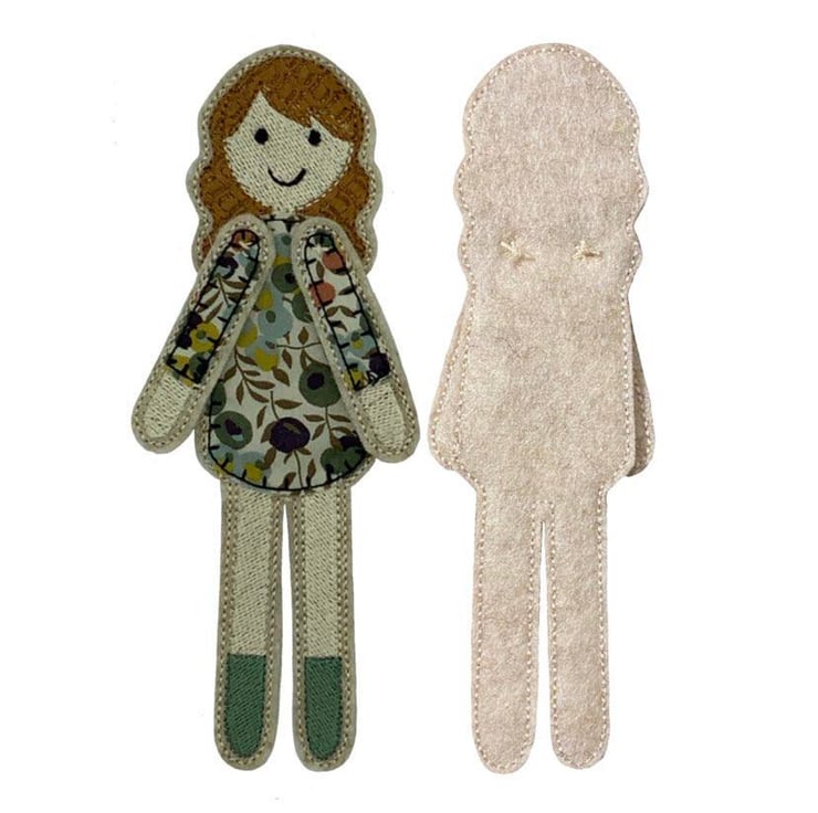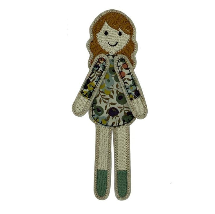Dolly is a pretty bookmark which peeks over the page in her Liberty floral berry printed dress. Dolly has a main body which sits behind the page with her arms and head peeking over the top. She is stitched using embroidery thread and Cotton Liberty print Tana Lawn on a base of Wool felt.