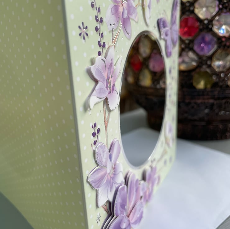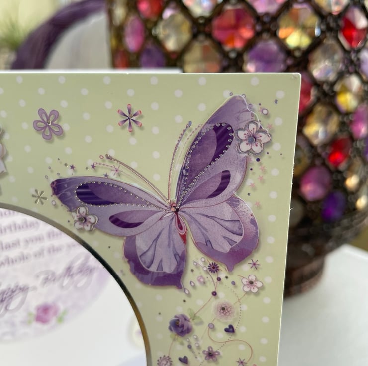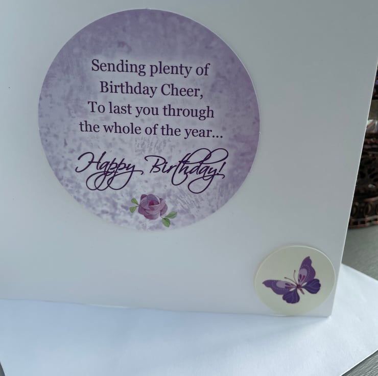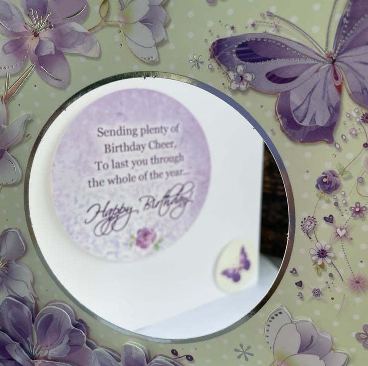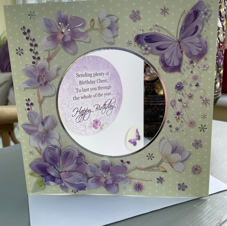 A delicate and floral birthday card. This 5x5 inch card features decoupaged flowers and butterflies surrounding a circular apature. This shows the greeting which is fixed to the inside of the card . This says sending plenty of birthday cheer, to last you through the whole year...happy birthday. The whole card is in pastel shades of green and lilacs. A lovely card to send to a loved one.