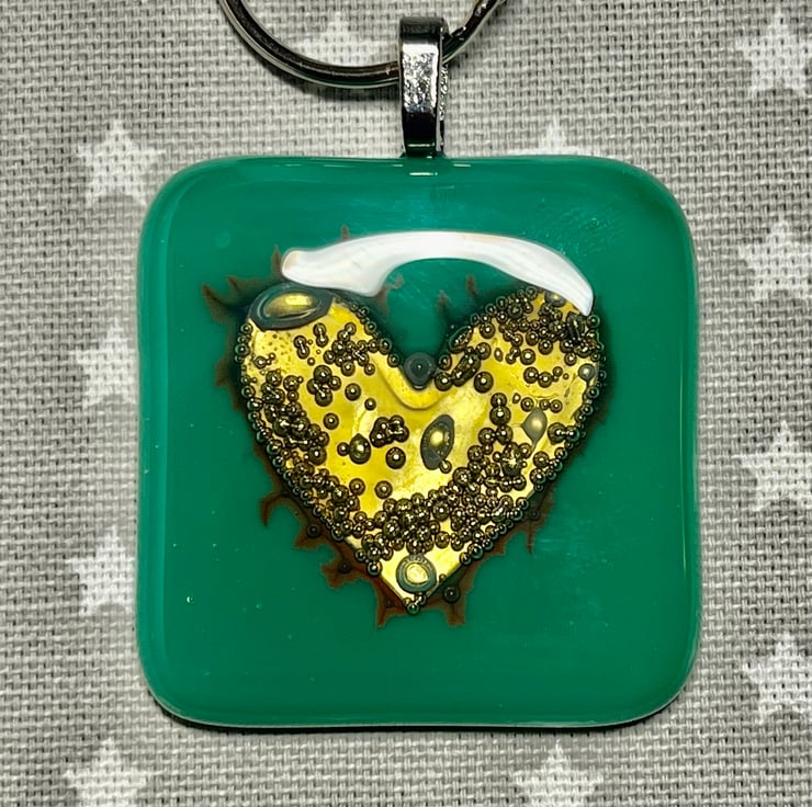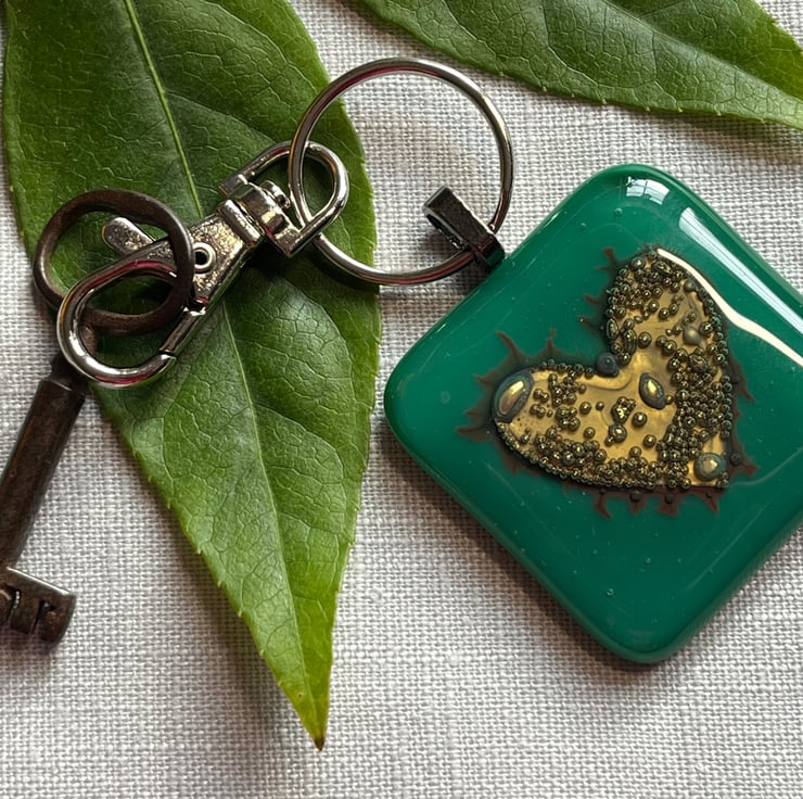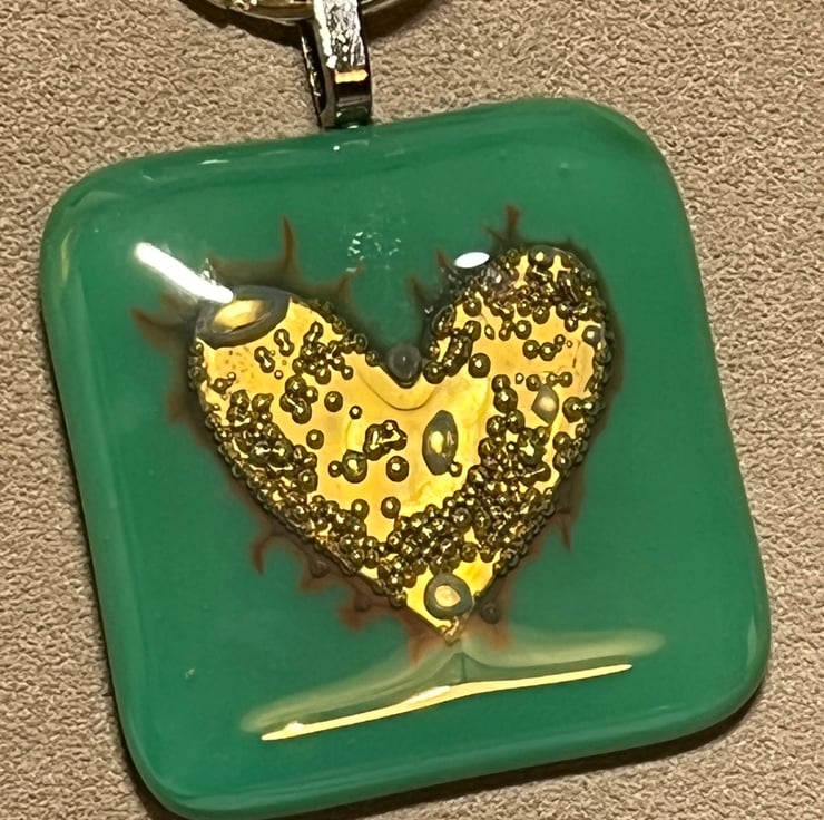 I have used a beautiful deep sea green glass on the bottom layer, and clear glass on top with a heart shape cut from thin brass sheet in between. The brass reacts by producing unpredictable effects and bubbles during the firing process and no two pieces will be exactly the same.
