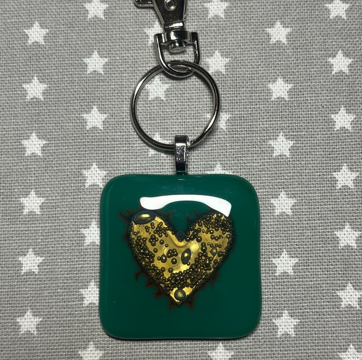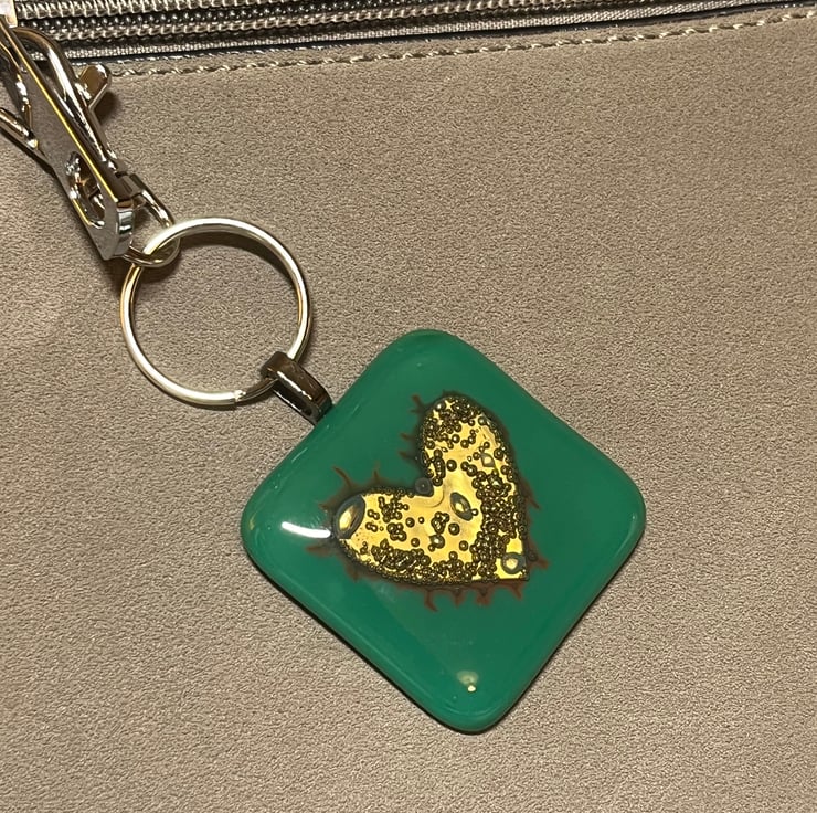 A fused glass bag charm or key ring, with a lobster claw attachment ready to add to your favourite bag or use as a key ring. Measuring 11 cm from top to bottom including the lobster claw and with the fused glass charm measuring approximately 4.3 cm square.