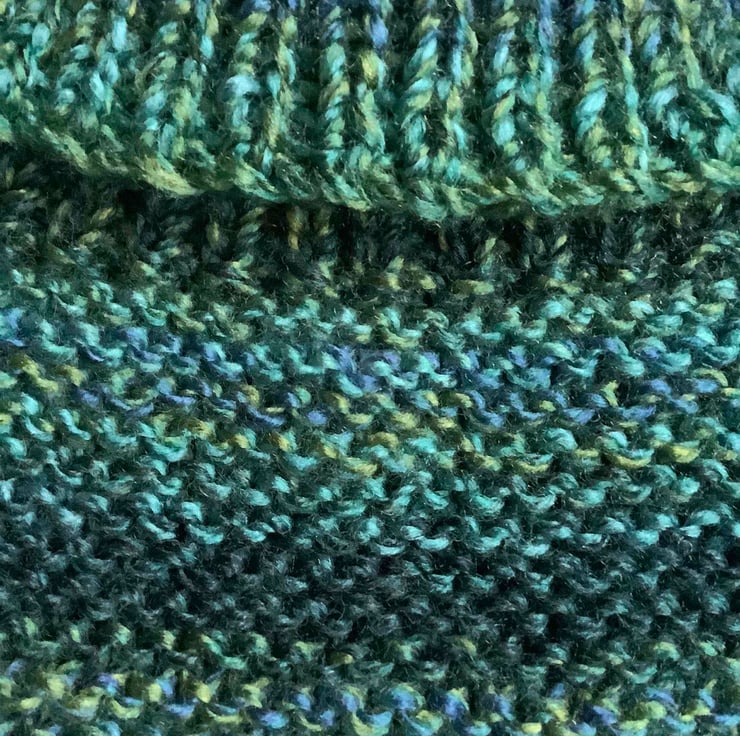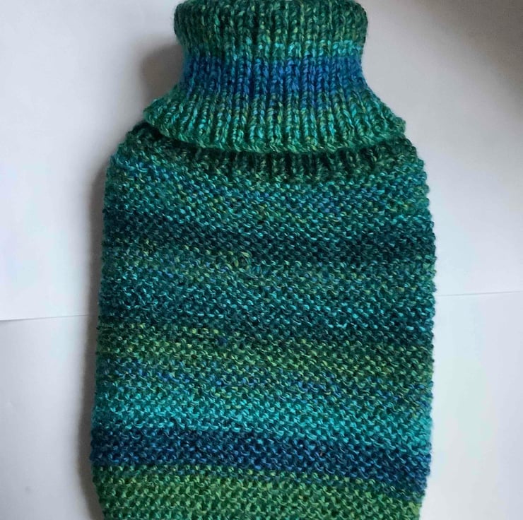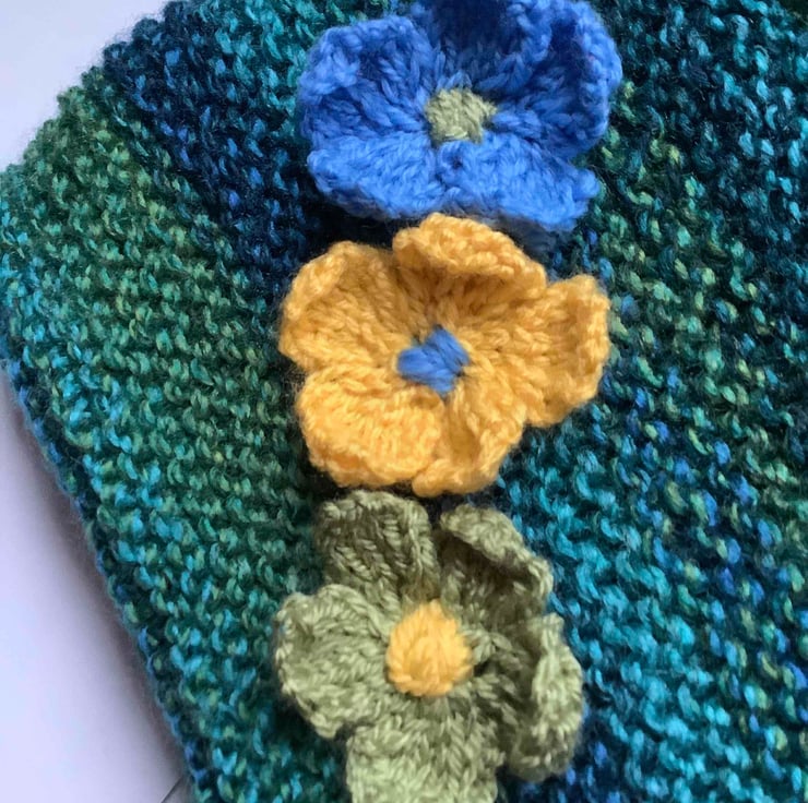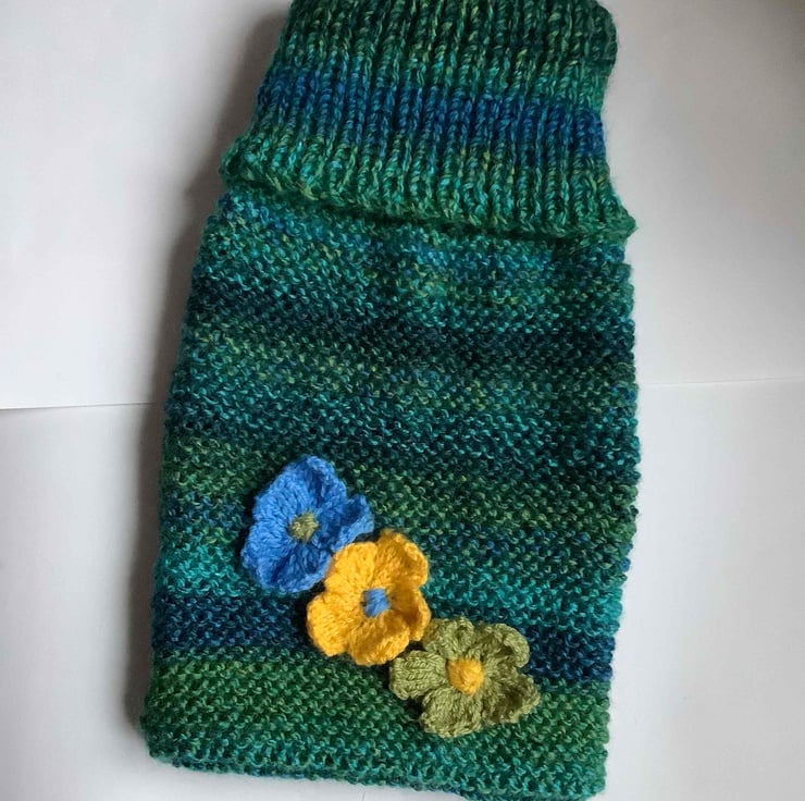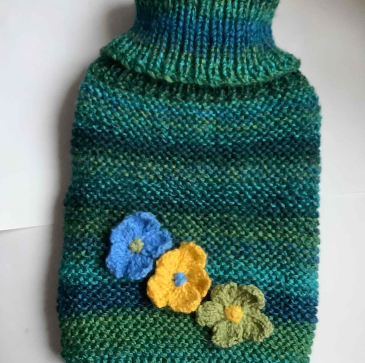 This hot water bottle cover is knitted with a gorgeous chunky yarn in blues and greens. There are 3 hand knitted flowers attached across the cover
