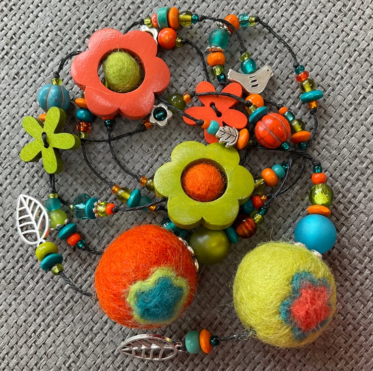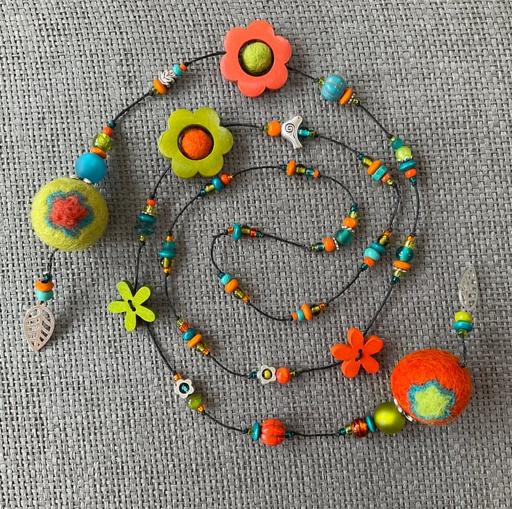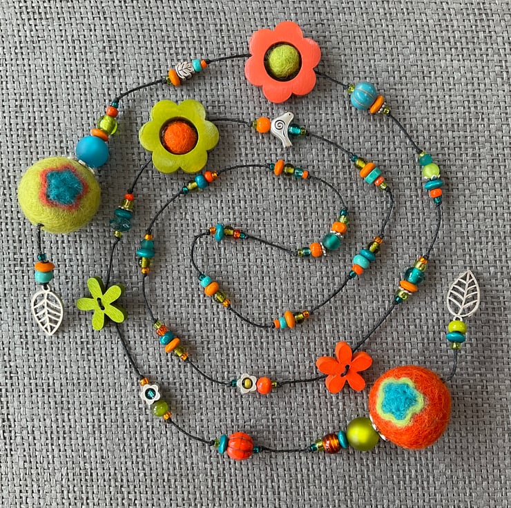Lariat necklace featuring a glorious mixture of beads in strong shades of lime green, turquoise and orange. The beads include large and small painted wood flowers, felt balls, glass, Polaris and wooden beads, as well as antique silver tone bird, leaf and flower beads. The necklace is finished at the ends with antique silver tone leaf charms and is strung on strong, flexible waxed linen thread.