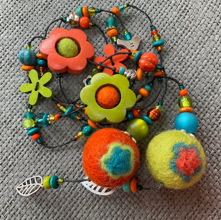 Polaris beads have a beautiful lustre that deepens on contact with the skins natural oils. Each large felt ball has two hand felted flower motifs in contrasting colours, which are slightly different on each face.