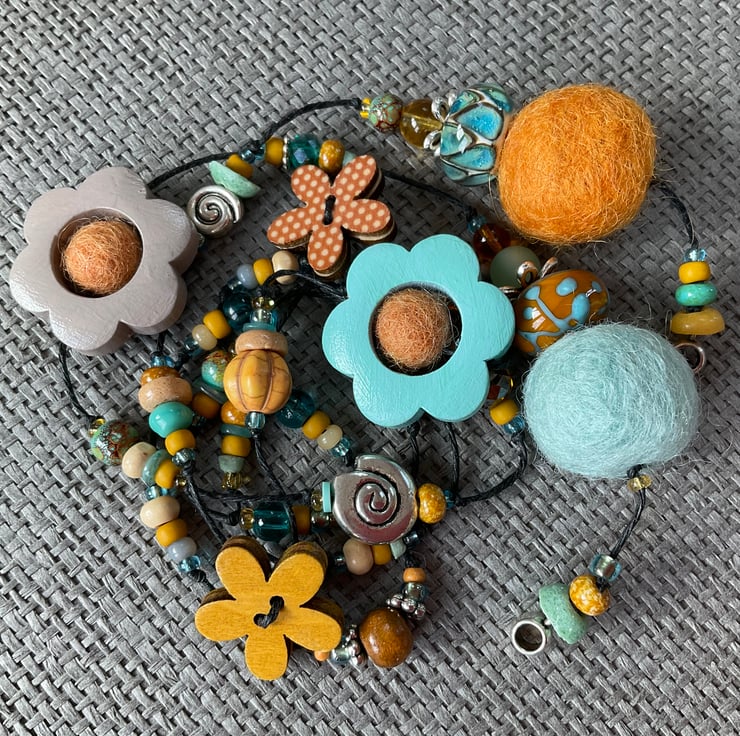 Lariat necklace featuring a glorious mixture of beads in shades of golden yellow, pale bluey-greens and gentle natural shades. The beads include large and small painted wood flowers, felt balls, glass, recycled glass, Polaris and wooden beads, as well as antique silver tone shell, spiral and flower beads.