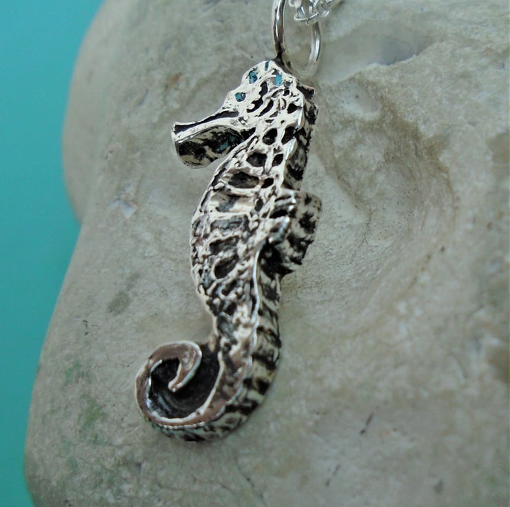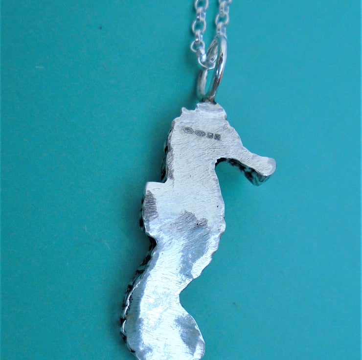 A mould was made by hand and then filled with recycled fine silver (pure silver) to create this solid fine silver seahorse pendant. The details of the pendant are highlighted by a patina silver finish.