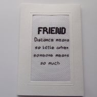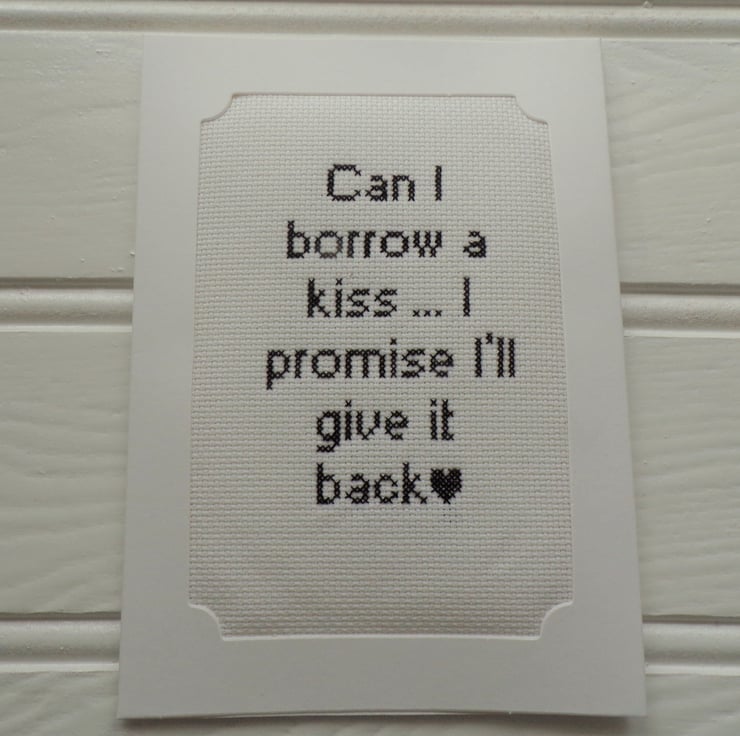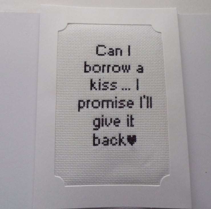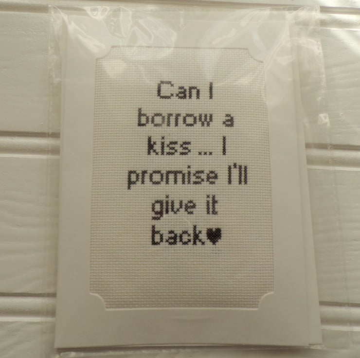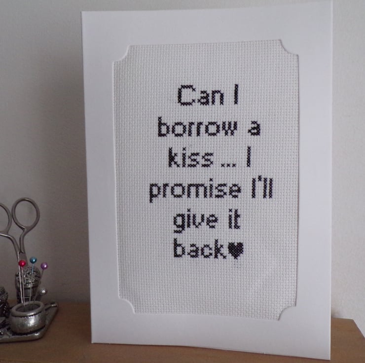 Valentine Card, Partner card card measuring 5 x 7 inches with the wording 'Can I borrow a kiss ... I promise I'll give it back'. The stitched aida is in a 3 fold white good quality 300gsm card, wadding has been placed behind the stitching to give a lovely padded effect. There is a blank white insert to write your own message. The card comes with a white envelope and will arrive in a clear cellophane bag for protection.