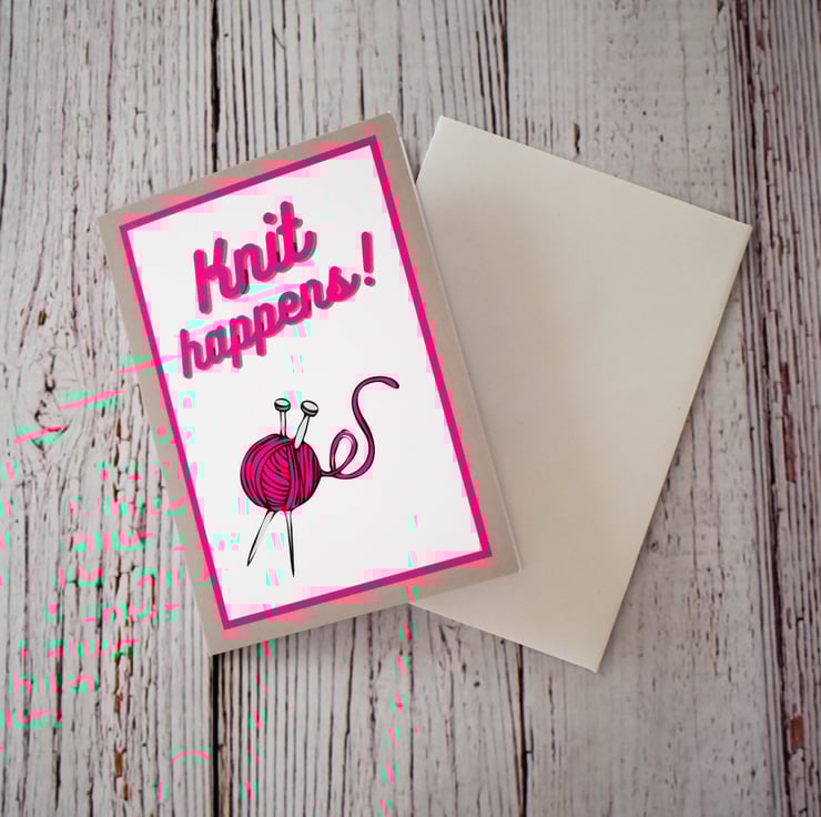 Knit Happens card featuring a ball of wool and knitting needles with coordinating text. Perfect for someone with a love of knitting.