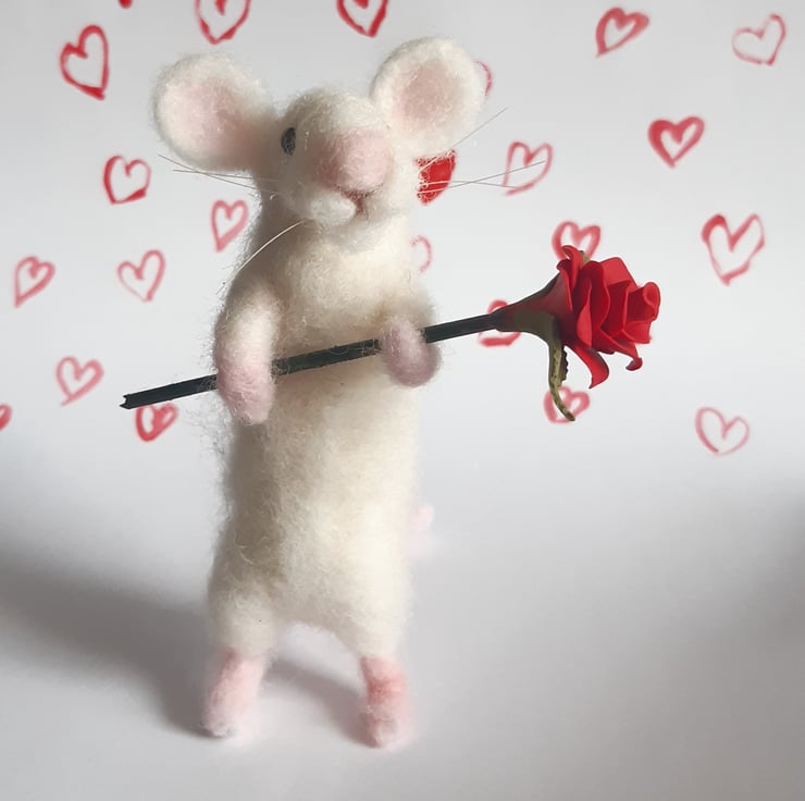 This sweet little needle felted mouse offering a single red rose would make a lovely gift for Valentines day, a wedding, Birthday, Anniversary or a gesture to say 'I'm sorry'.