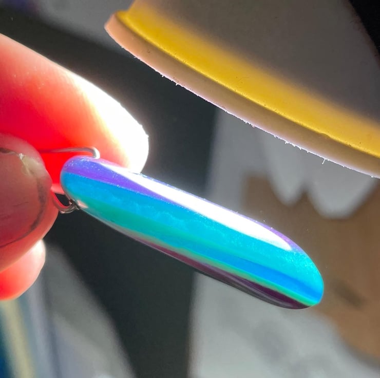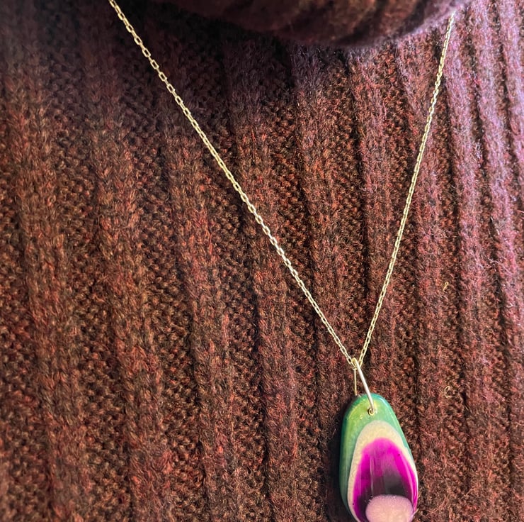 This particular piece contains pearlescent colours in deep pinks and greens resembling a Watermelon tourmaline gemstone but only a fraction of the weight. Before carving I study the colours to ensure I capture the most stunning combinations