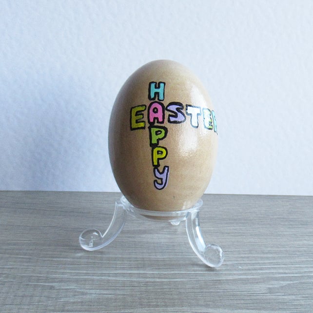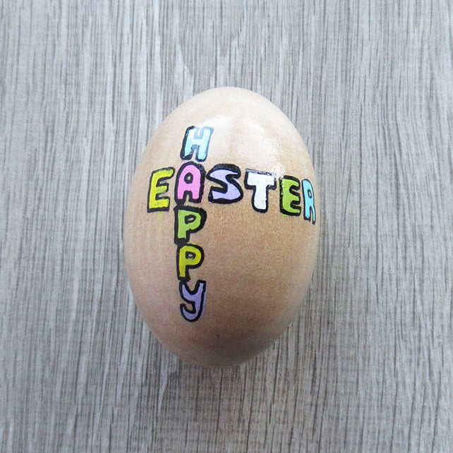This Easter ornament has a fun and happy waving Easter chick on one side, painted with acrylic paint in bright yellow and the text ‘HAPPY EASTER’ has been painted to the reverse side in lime green, yellow, lilac, pink and turquoise.