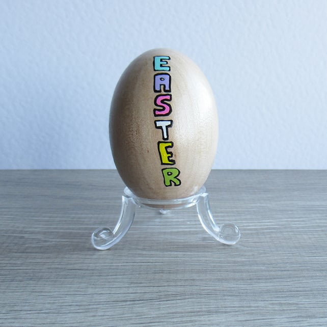 This Easter ornament has a fun Easter chick on one side, painted with acrylic paint in bright yellow and the text ‘EASTER’ has been painted to the reverse side in lime green, yellow, lilac, pink and turquoise.