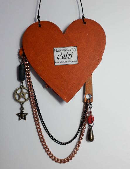 This is a 10cm heart decorated with various found bits and pieces, I then painted it with orange, red, green and black acrylics and copper gilding wax, then finished with a coat of varnish.