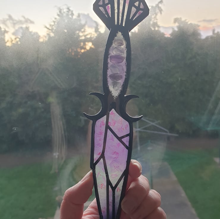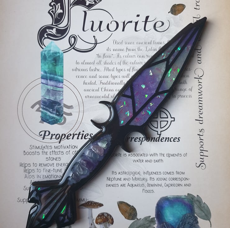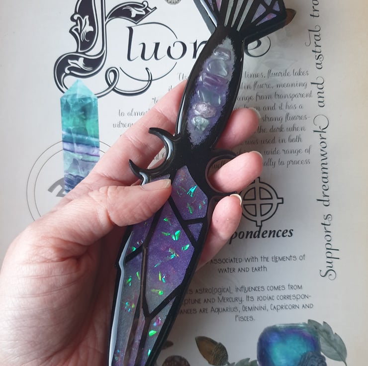 This athame has been hand crafted over a period of several days, using multiple layers of three different types of resin. It has been filled with love and care.
