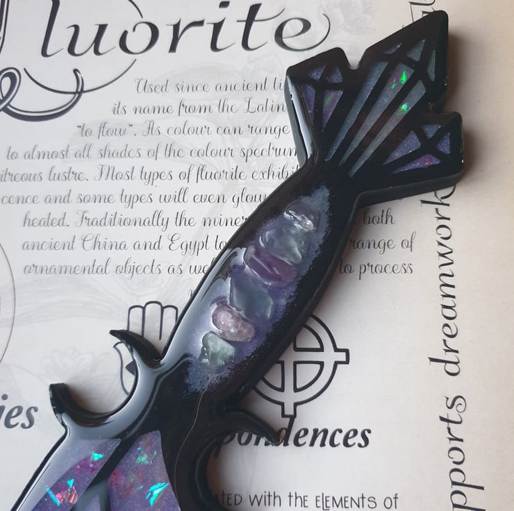 The handle has been adorned with beautiful rainbow fluorite crystals.
