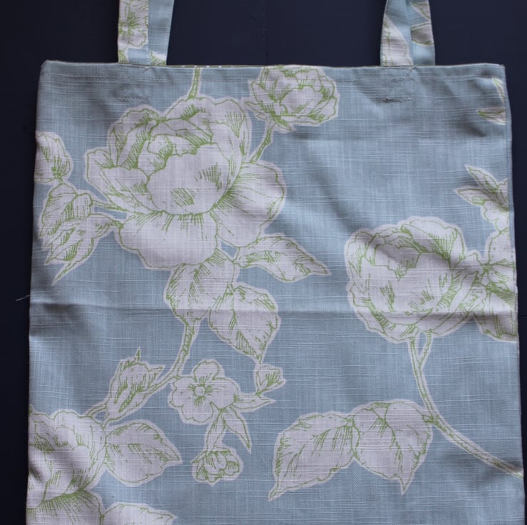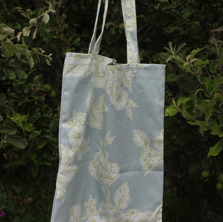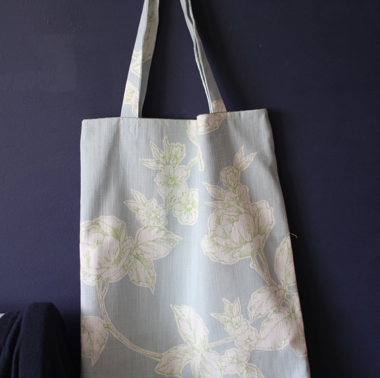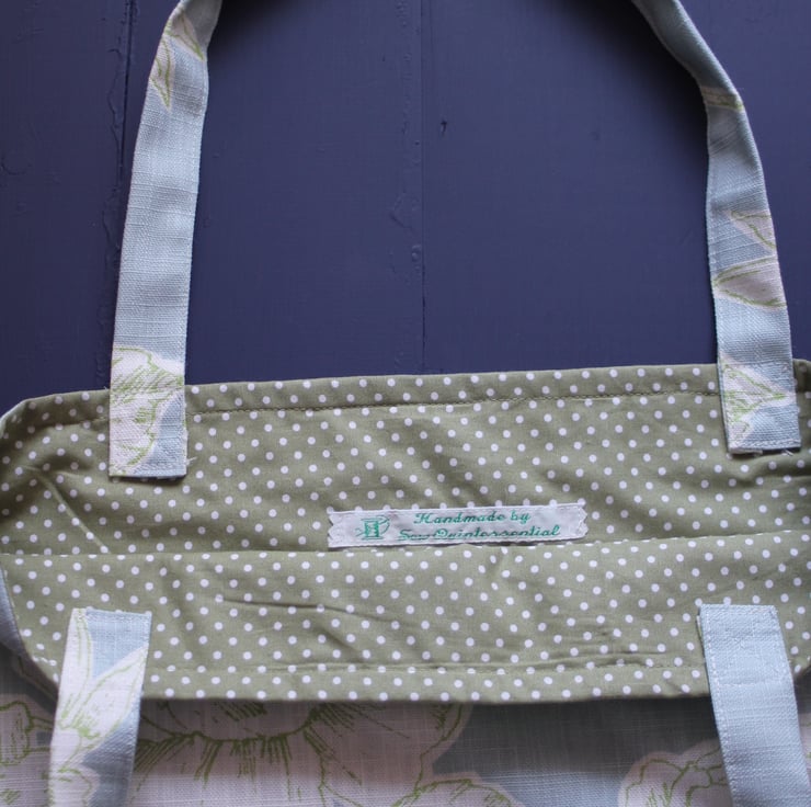 Perfect for Spring, this gorgeous floral shopping bag is made from a remnant of Laura Ashley linen fabric featuring white and green flowers on a blue background. It is lined with sage green polka dot cotton fabric.
