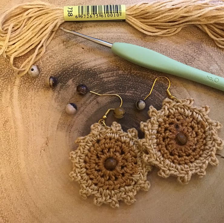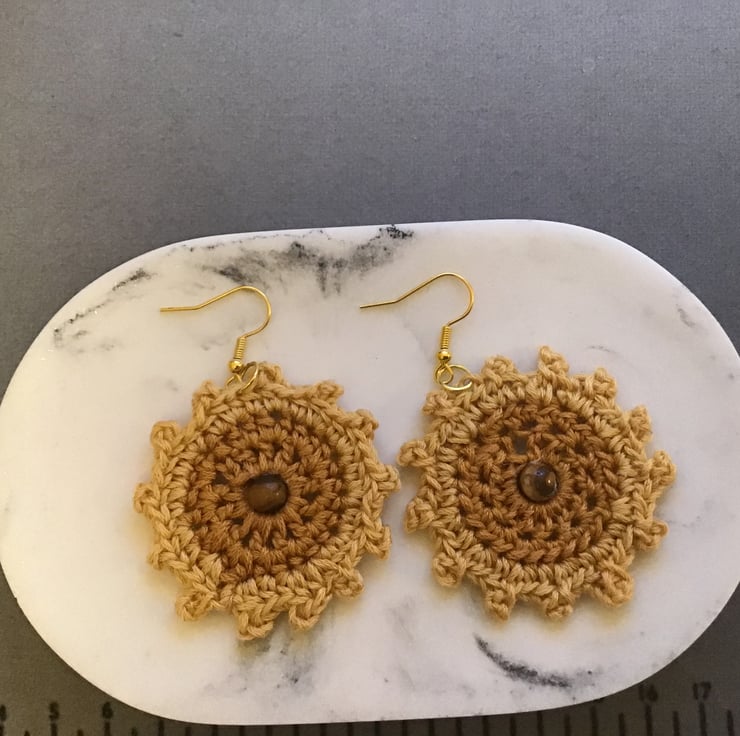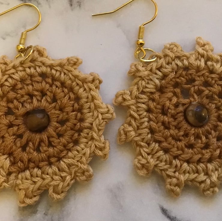 Quirky and unusual boho vintage style handmade crochet earrings. Made with cotton threads in cream and honey with a contrasting centre bead. Gold plated findings and hooks. 7cm length and 5cm wide. Semi stiffened for durability so you can enjoy for years to come.