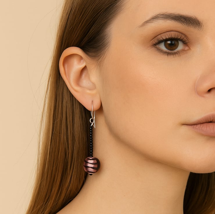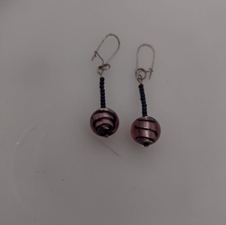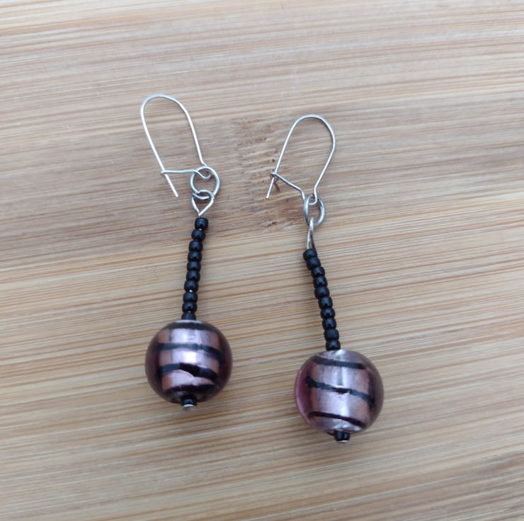 Purple and black striped round glass beads together with purple seed beads. The earrings are suspended from a hook earwire and all metal components are silver plated. The earring drop is 1 inch (2.5 cm)