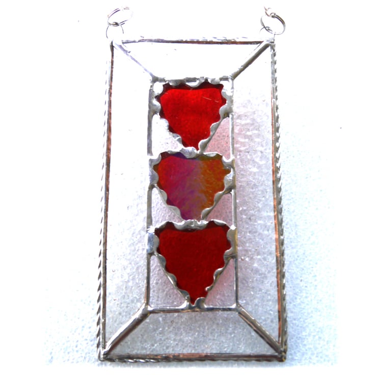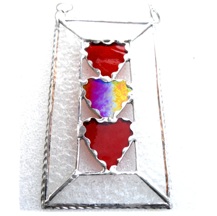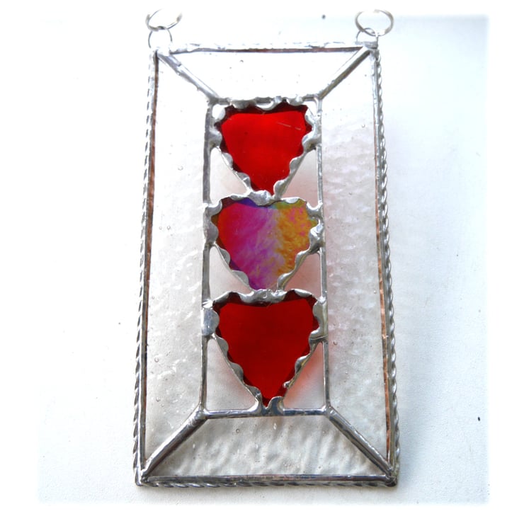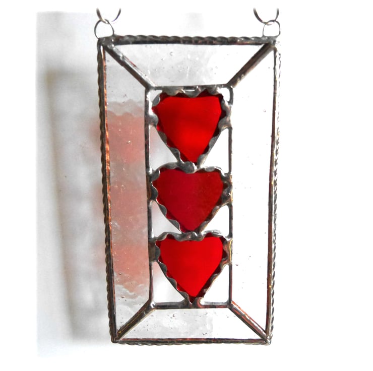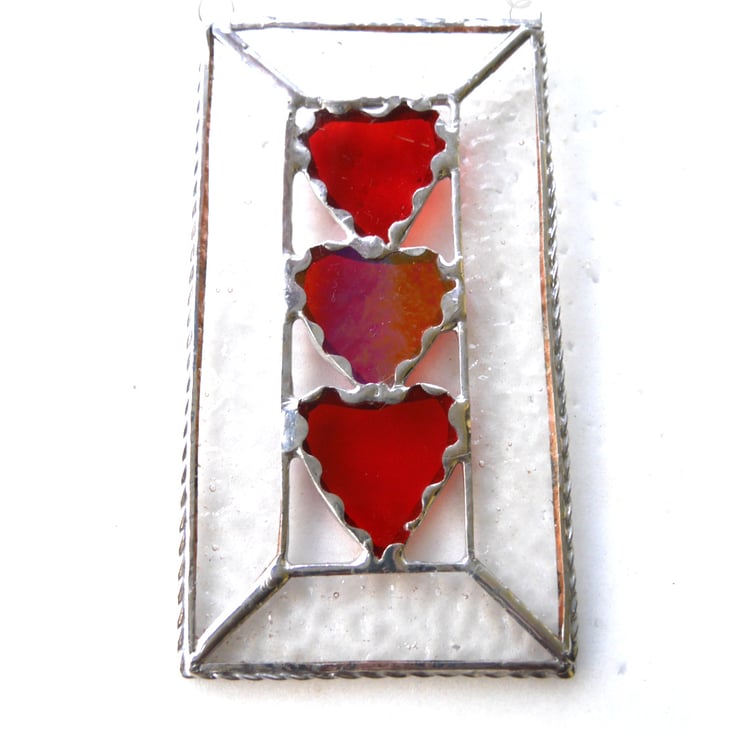 The inch wide ‘frame’ is made of clear glass with a pretty texture and iInside is a ‘picture’ which is a column of 3 red glass hearts. The hearts are cut from three different types of red glass.
