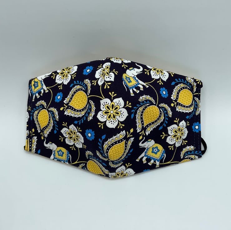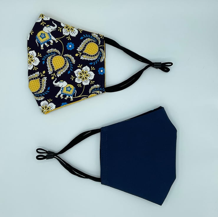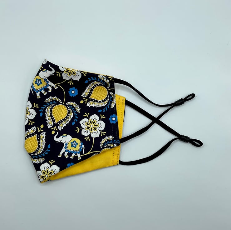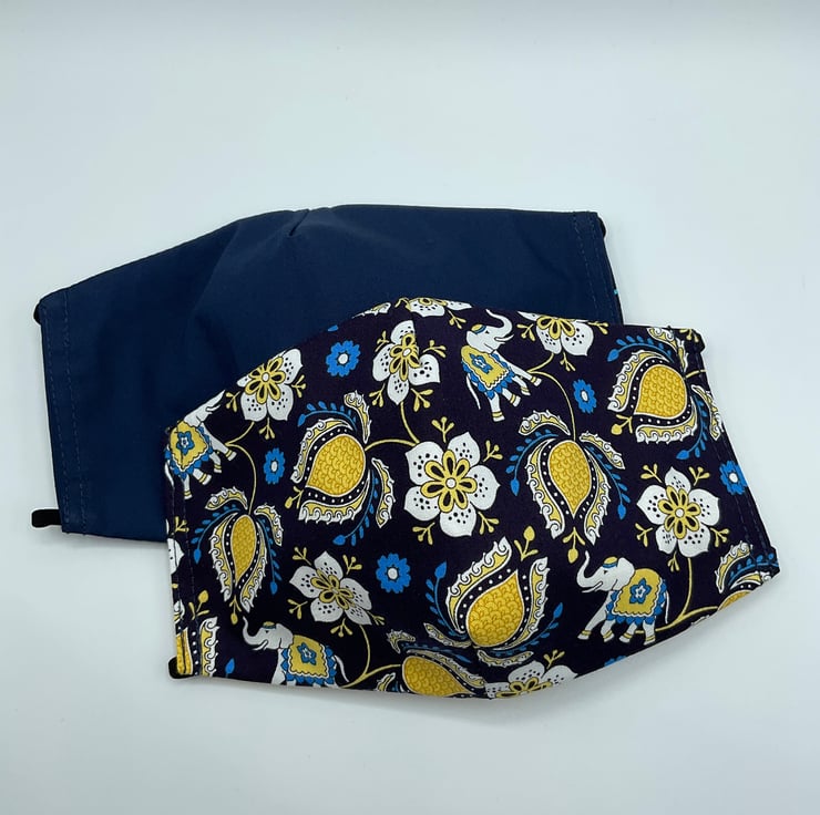 This is a double sided face mask, made from an ornate navy blue fabric with flowers and elephants on one side and a choice of plain navy blue or yellow on the other.