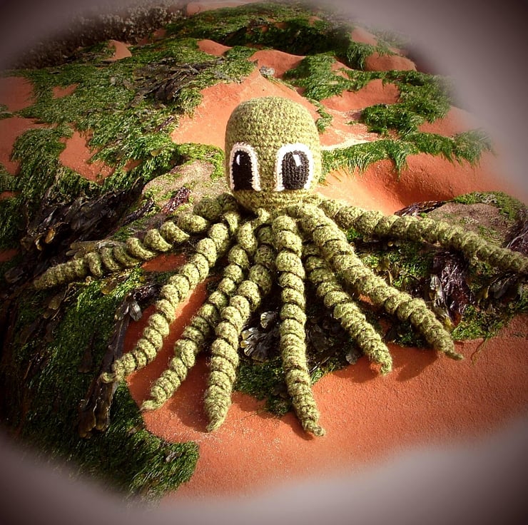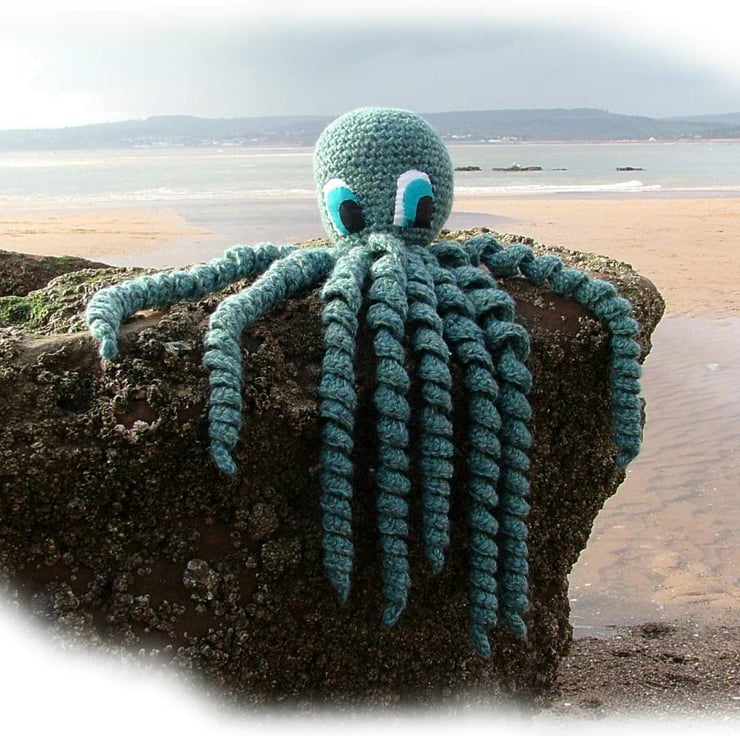 Georgina made and designed these crochet Octopus in the 1990s. We then decided to take some new photos on Exmouth beach in Devon with Dawlish and Torbay in the background. We had a lot of fun posing the creatures ad gave lots of amusement to bystanders