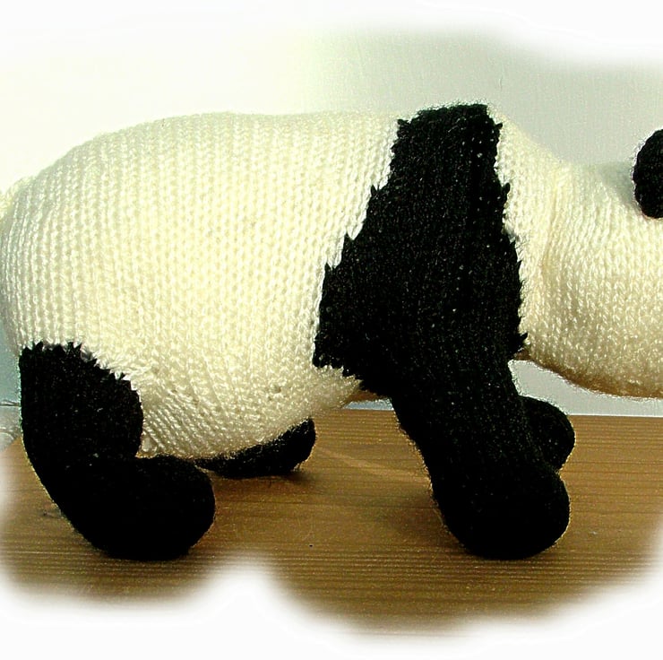 Georgina was asked to knit a collection of endangered animals for the Woman's Institute Home and Country magazine in 1992. In that year Pandas numbered less than 1000 in Western China .Its population dropped to under 300 but mercifully Pandas numbers are now around 1800. Hurrah for Pandas