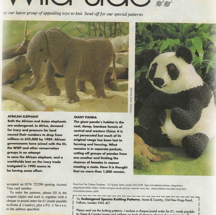 This lovely pattern was designed by the designer Georgina Manvell. The pattern was first published in Home & Country magazine in April 1992. The article was called Knit on the Wild Side ( Endangered Species). We have included a picture of the Giant Panda featured in the original Home & Country magazine
