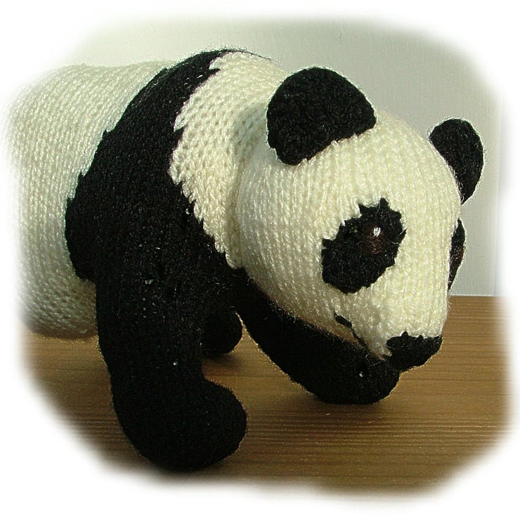 Mr Panda measures 20cm (8 in) high and 30cm (12 in) long when completed in Chunky yarn This pattern uses 4mm knitting needles and approx 100g of yarn. For a smaller Panda ,DK yarn is used on 3mm knitting needles