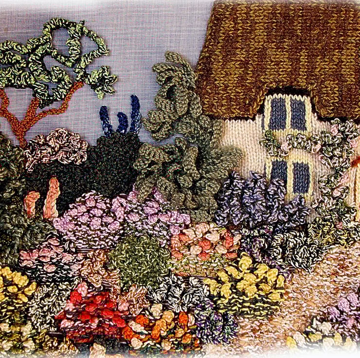 Georgina created this wonderful knitted garden while she was a teacher at Denman College for the Womens Institute near Abingdon .It proudly hangs in Suzannahs home for her to enjoy everyday
