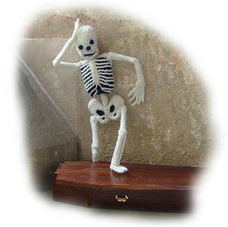 The joints are all moveable including his jawbone and his head turns from side to side. He even has a fibula bone!. An easy pattern to follow with lots of helpful illustrations.