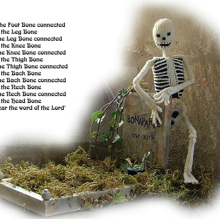 Georgina and Suzannah had great fun designing Bonaparte Ginas husband Bob made the coffin, the gravestone and the piano featured in our larger pattern .A bible verse from Eziekiel seemed perfect to us
