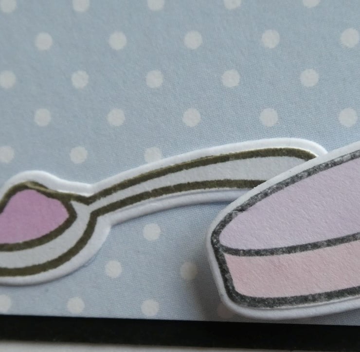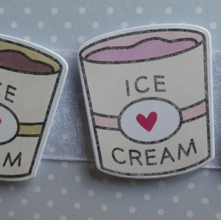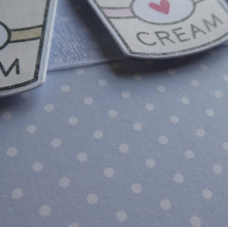 A square of pale blue and white polka dot card has been wrapped around the centre with a length of white organza ribbon and 3 hand coloured tubs of ice cream have then been attached, raised on foam to add dimension.