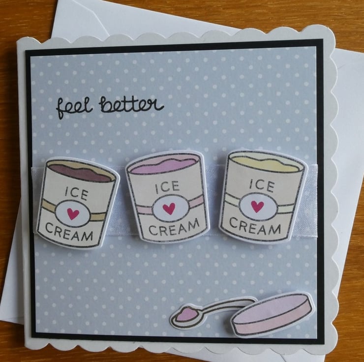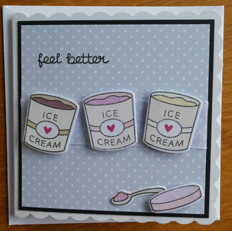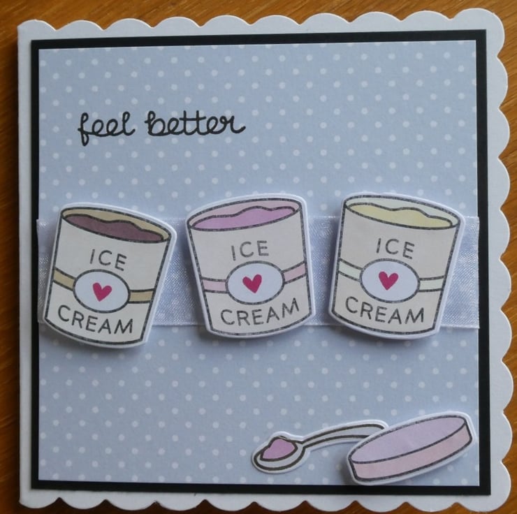 An ice cream tub lid and a spoon ready loaded have been added at the bottom and the greeting Feel Better has been hand stamped at the top.