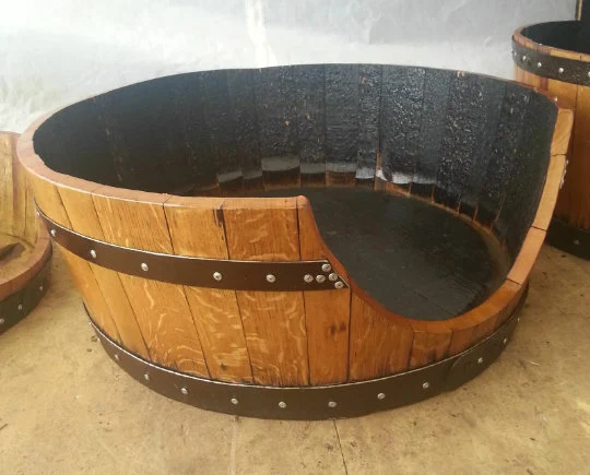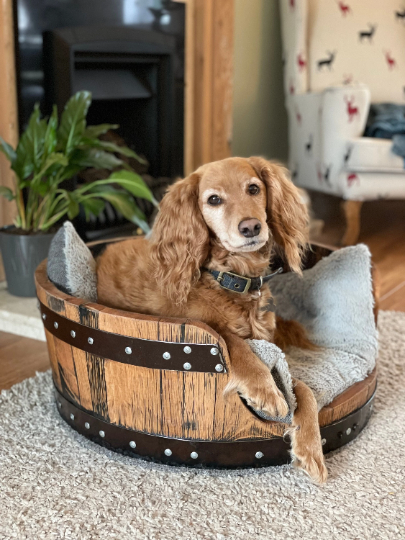 This stunning dog bed is made from a solid oak barrel and has been designed for a medium sized dog.
