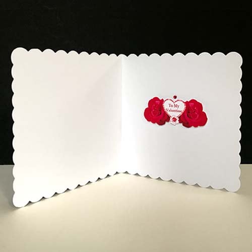 This beautiful card is a perfect Valentine’s Day card. Red Roses are always a favourite. A rich red central rose, photographed in my own garden, with patterned grasses and leaves it holds a decorative patterned heart. A pair of birds frame a smaller heart with the words ‘I Love You’. This uniquely designed scene is mounted on a white scalloped edge card embellished with red glass gems. Inside there are another two red roses framing a small heart saying ‘Happy Valentine’s Day’