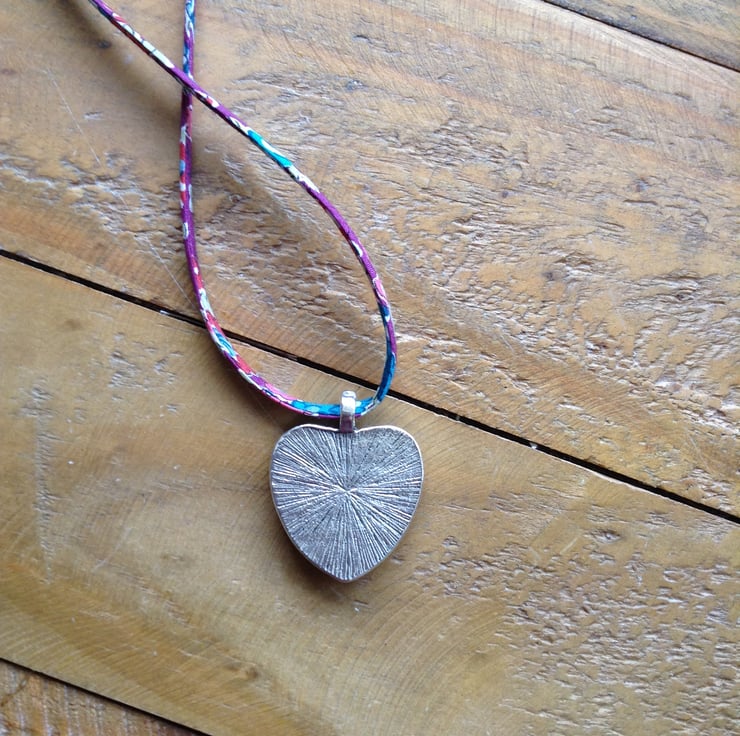 I have embellished a heart shaped piece of felt with Liberty fabric, crochet lace, an embroidered bead and button meadow, and a silver metal dragonfly bead. The edge of the felt is sewn with tiny blanket stitch. This is set in a heart shaped silver metal pendant tray which measures 2.5cm at widest point.