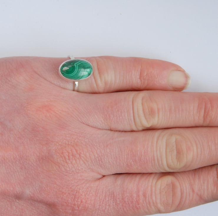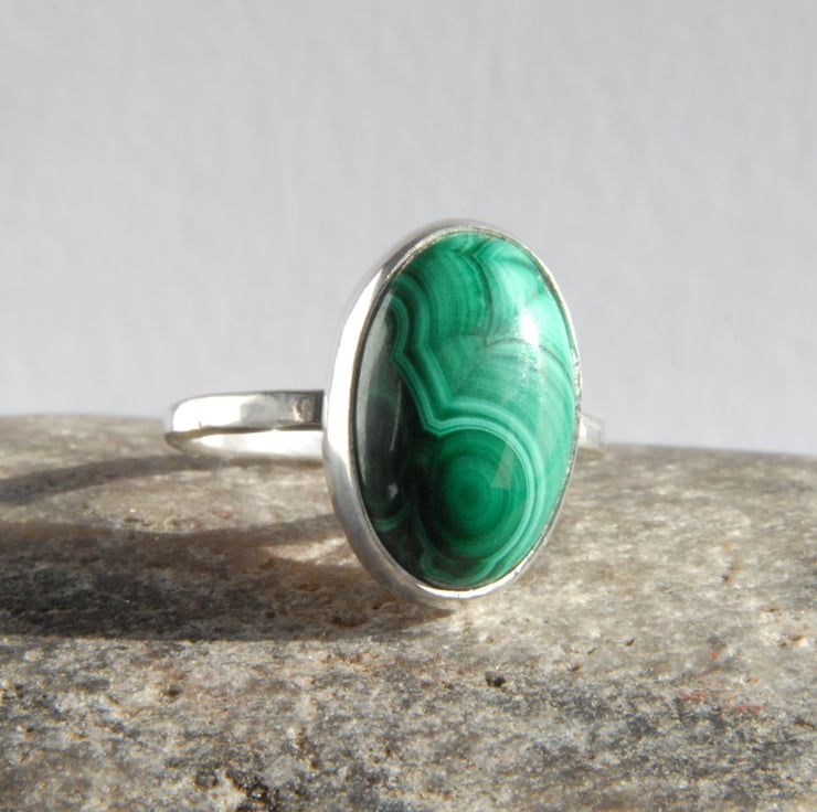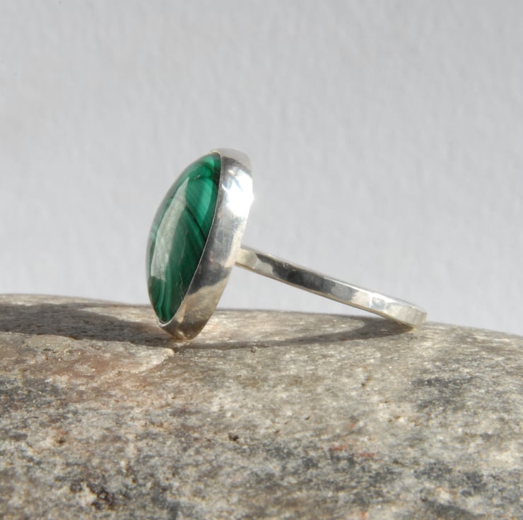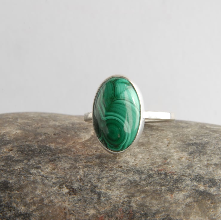 Malachite and sterling silver ring, size L, malachite is approx 14mm by 9mm on a 1.5mm wide lightly hammer textured band.