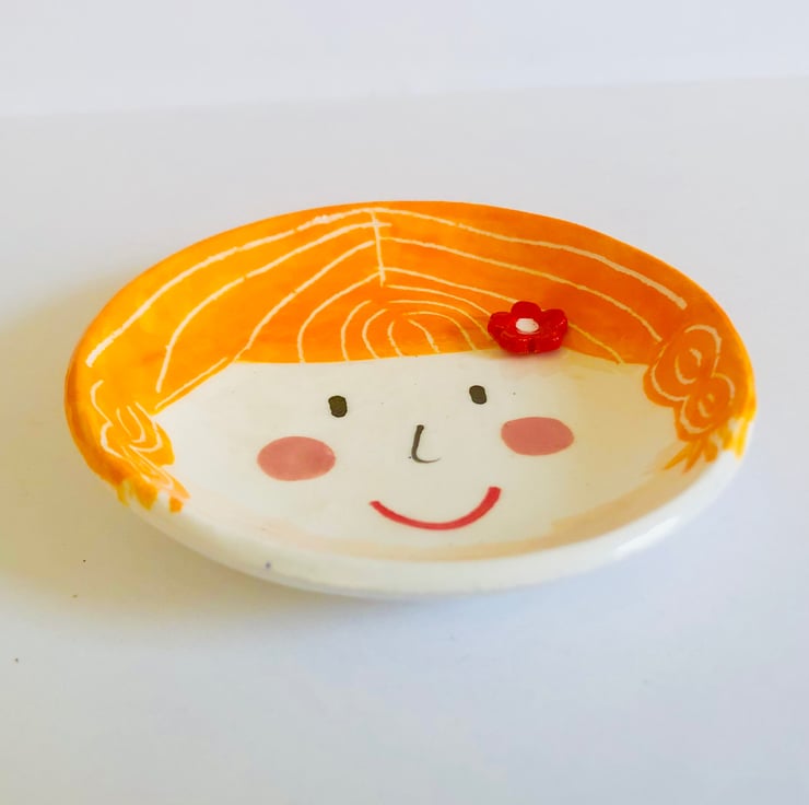 This Happy Face trinket dish is handmade from porcelain clay and decorated with colourful underglazes. It has then been fired twice in the kiln - the second firing with a transparent glossy glaze. It measures 8.5cm. Ideal for keeping jewellery safe by the bedside. Makes a beautiful birthday/ anniversary gift.