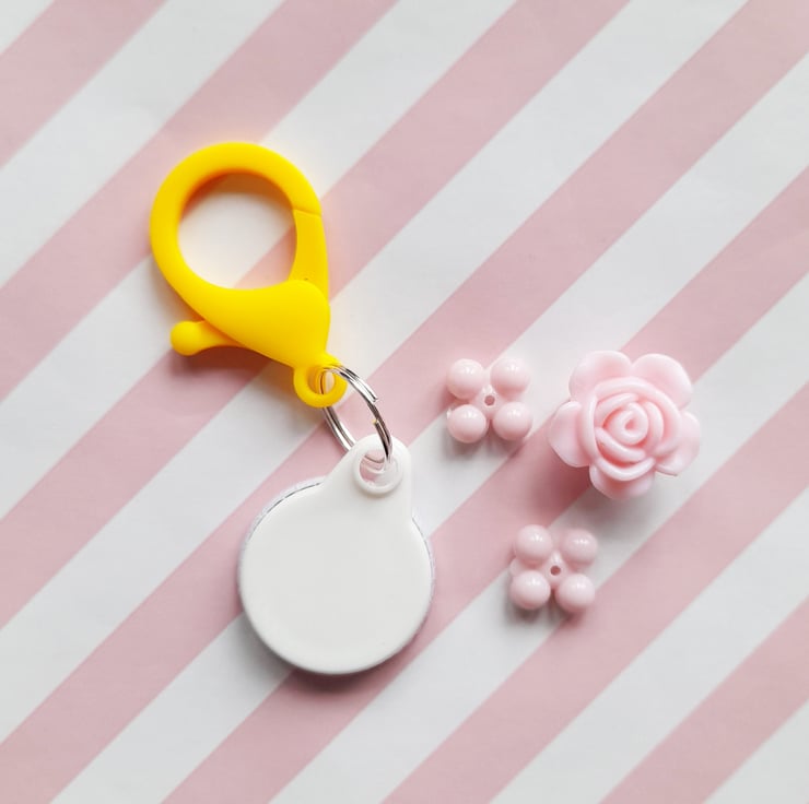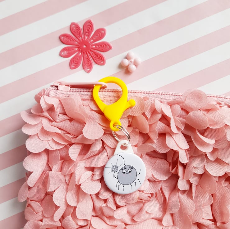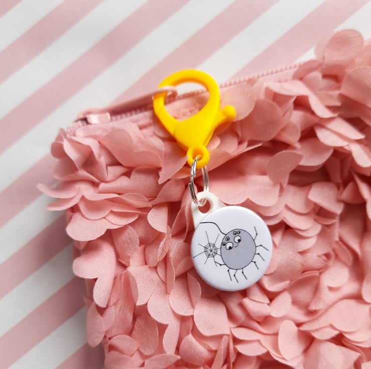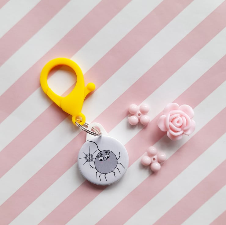 The spider charm is 25mm in diameter and has a pink plastic lobster clasp for clipping on a bag attached by 14mm split ring.