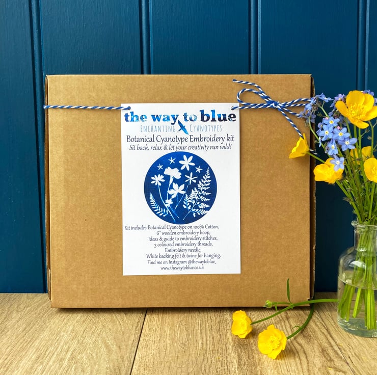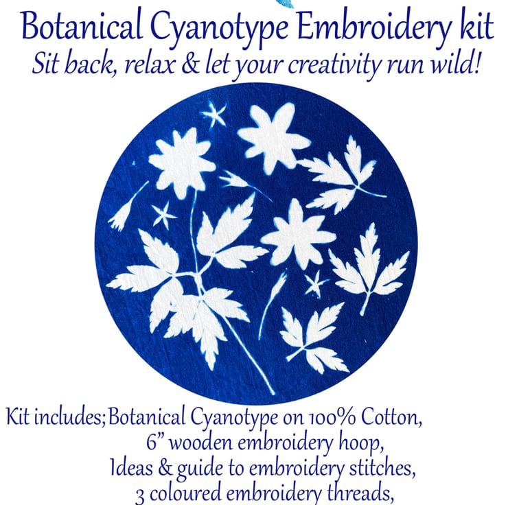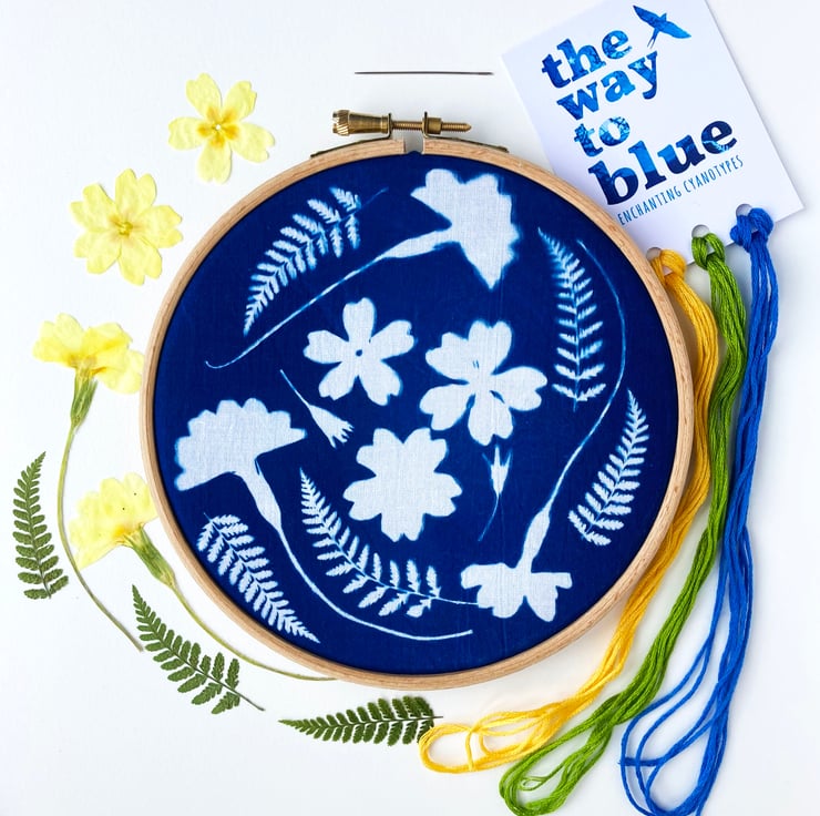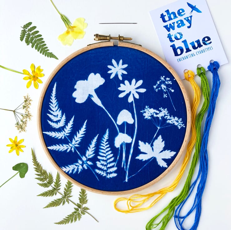 Botanical Cyanotype embroidery kits featuring various wild woodland flowers and plants such as Wood anemone, Ferns, Celandine, Stitchwort, Primroses & Cow Parsley.