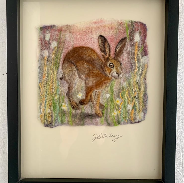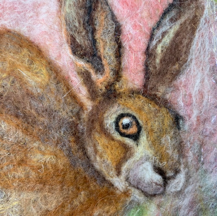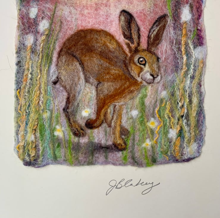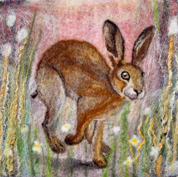 Original handmade felted ‘painting’, depicting a little brown hare caught unawares in the meadow.