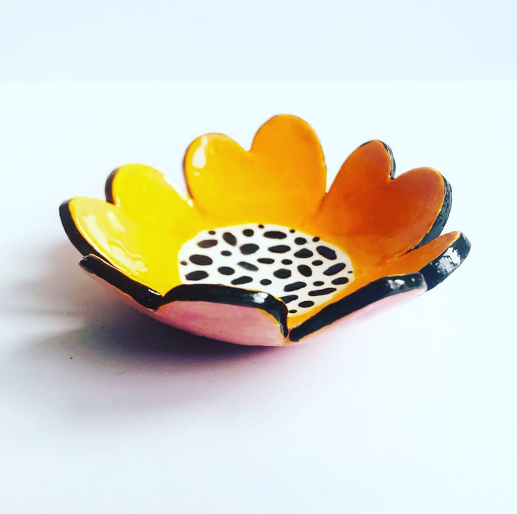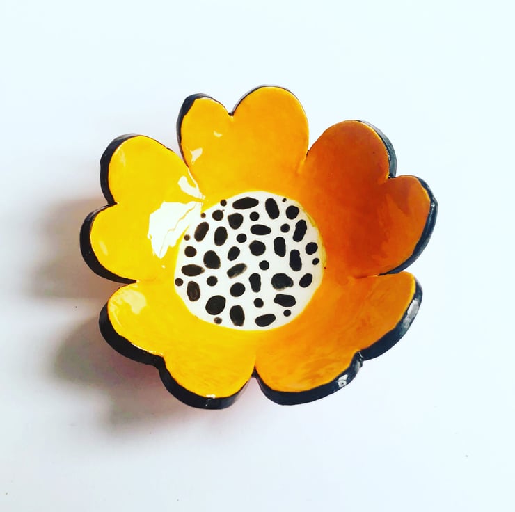 This orange poppy trinket dish is handmade from porcelain clay and decorated with colourful underglazes. It has then been fired twice in the kiln - the second firing with a transparent glossy glaze. It measures 7.5cm across. Ideal for keeping jewellery safe by the bedside. Makes a beautiful birthday/ anniversary gift.