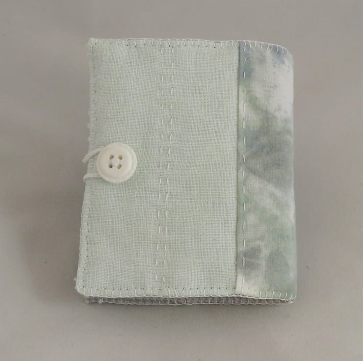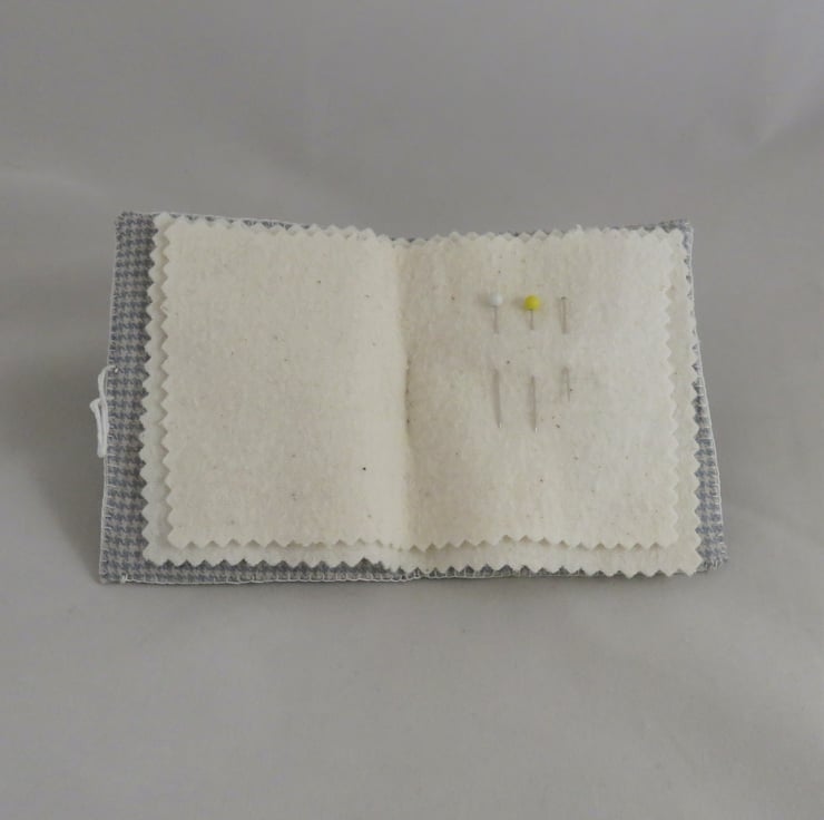 The needle book is lined in a green and cream vintage checked fabric. Two pieces of vintage soft flannelette are folded and securely stitched in place, to provide four 'pages' for your needles and pins. The needle case closes by a button hole stitch loop over a white button.