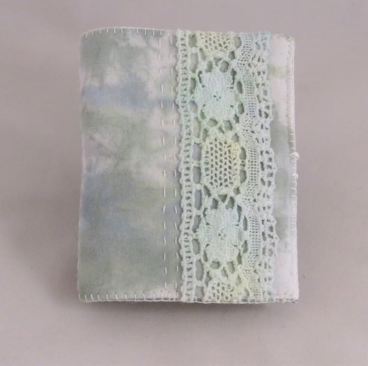 A pretty, hand-painted, needle book, entirely hand-stitched from vintage textiles and featuring a portion of hand painted, vintage lace, together with hand painted and hand dyed fabrics.